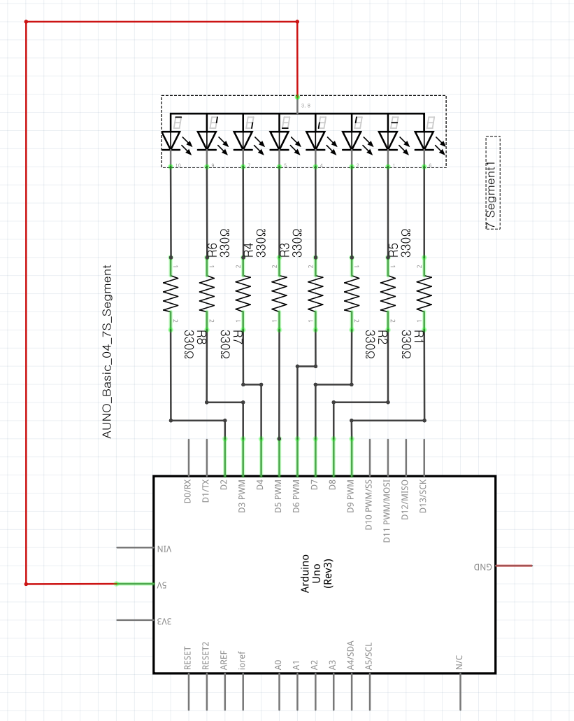 - 저항이 내장되어 있지 않으므로 디지털 출력 2~9번 포트를 각각의 저항(330ohm)을 통하여 7 세그먼트 핀으로 연결됨
