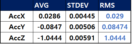 AccX, AccY, AccZ의 평균값은 거의 0g, 0g, -1g 즉, 지면에 수평으로 누워져 있는 상태를 표시하고 있다. 표준편자(STDEV)를 보면 0.05이하로 데이터시트에서 제시한 수준으로 측정됨을 알 수 있다. 굉장히 적은 편이다.