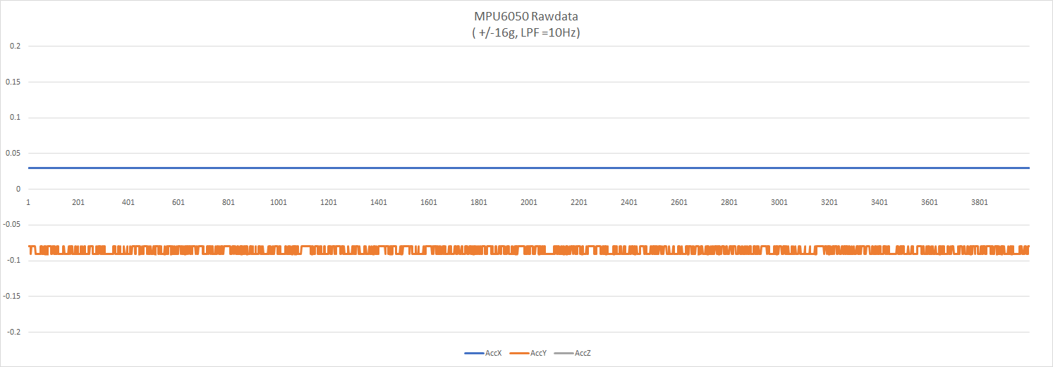 AccX, AccY, AccZ의 평균값은 거의 0g, 0g, -1g 즉, 지면에 수평으로 누워져 있는 상태를 표시하고 있다. 표준편자(STDEV)를 보면 0.05이하로 데이터시트에서 제시한 수준으로 측정됨을 알 수 있다. 굉장히 적은 편이다.