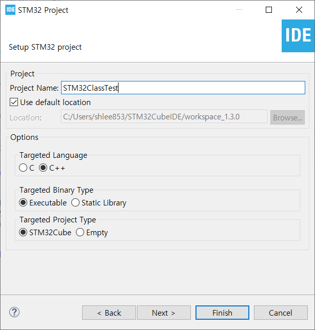 아래와 같이 STM32 프로젝트로 생성하고, Target Langeuage를 C++로 생성한다.