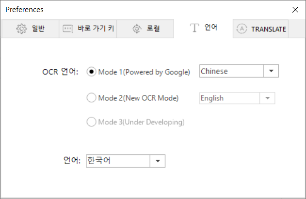 Mode1은 구글 문자인식기를 사용하는 방법이고 인식할 언어를 선택한다.