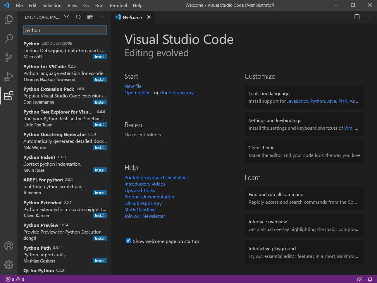 검색창에서 'python'이라고 입력한다. 여러가지 extention들이 나오는데 그냥 Python 이라고 되어 있는 extention을 설치한다.