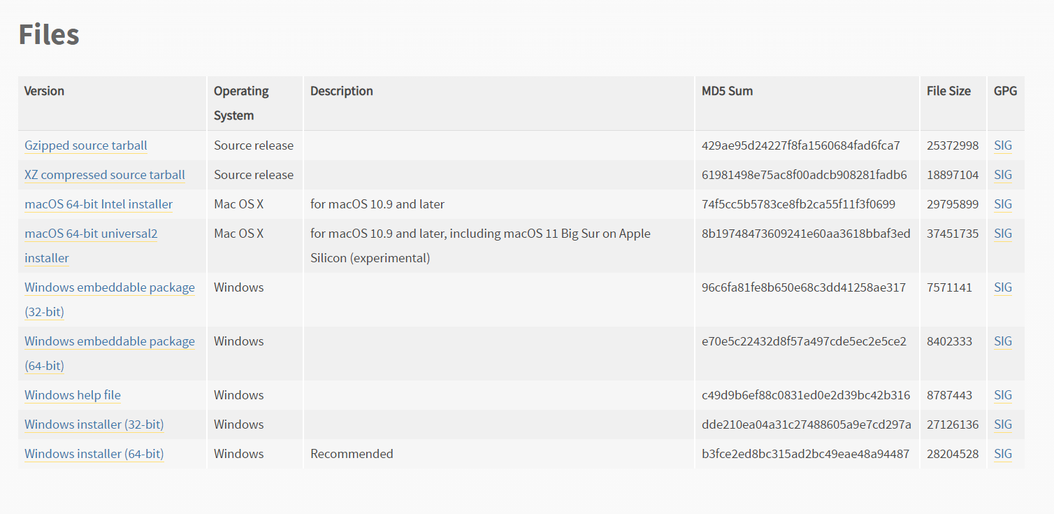 링크 아래쪽을 보면 다운 받을 수 있는 버전들이 OS별로 있으니 자신이 사용하는 운영환경에 맞는 파일을 다운로드 받아 설치하면 된다. 참고로 본인은 윈도우 10 64bit 환경이므로 맨 아래쪽 recommended된 파일을 선택하여 설치한다.