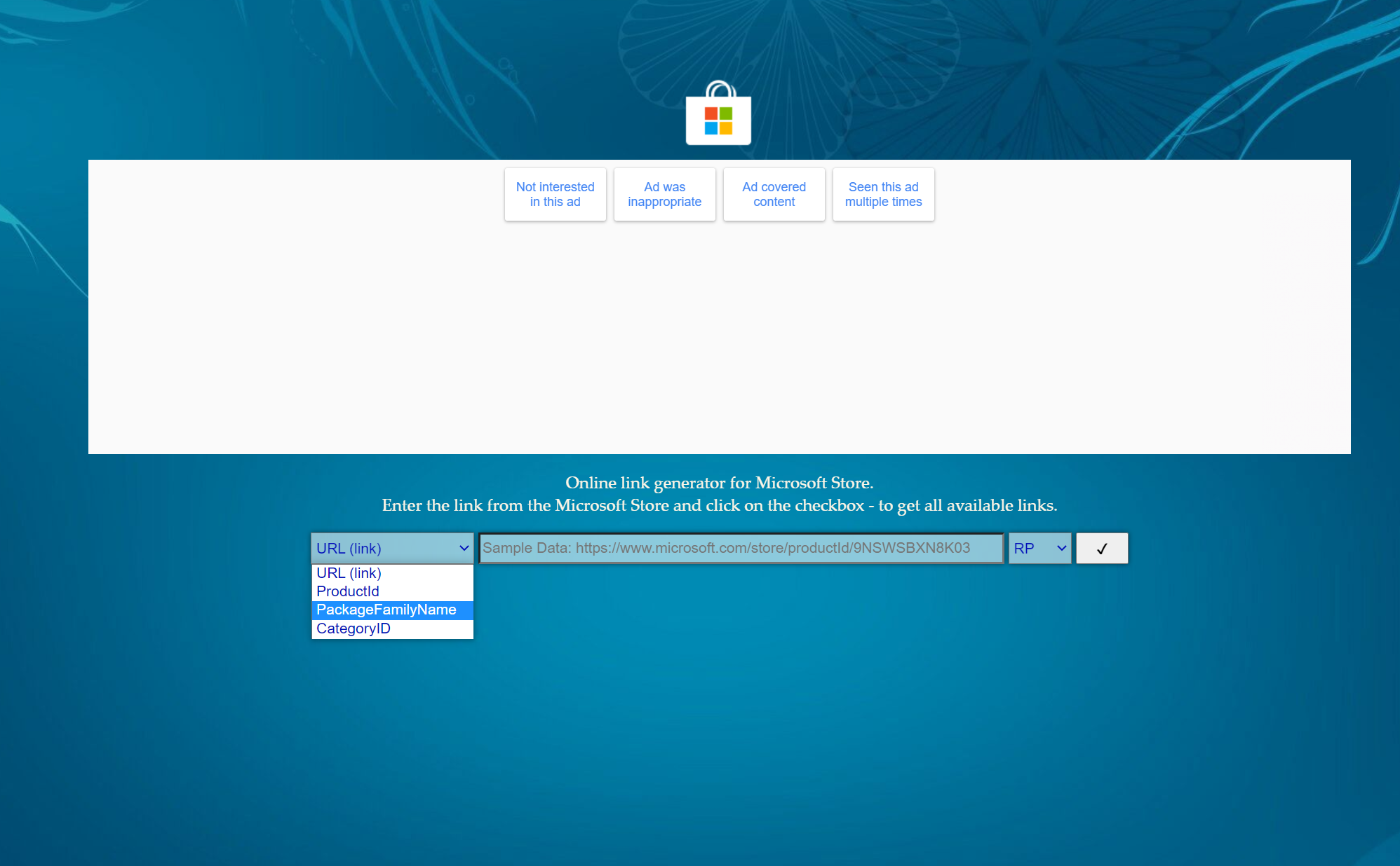 Online link generator for Microsoft Store. You can use it to get links to almost all apps, games, themes from the Microsoft Store.