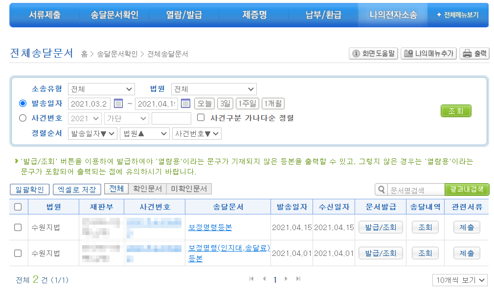 다음은 보정명령을 이행하기 위해 피고의 주소를 수정하여 제출해야 한다. 상단 메뉴중 송달문서 확인을 누르면 전체 송달문서중 보정명령등본을 볼 수 있다. 여기서 오른쪽 관려서류 제출을 작성한다.
