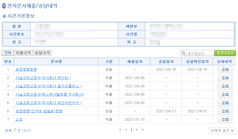 법원에서 보정명령등본이 날아왔다. 아래에서 오른쪽 상세내역을 확인하면 송달내역을 열람할 수 있다.
