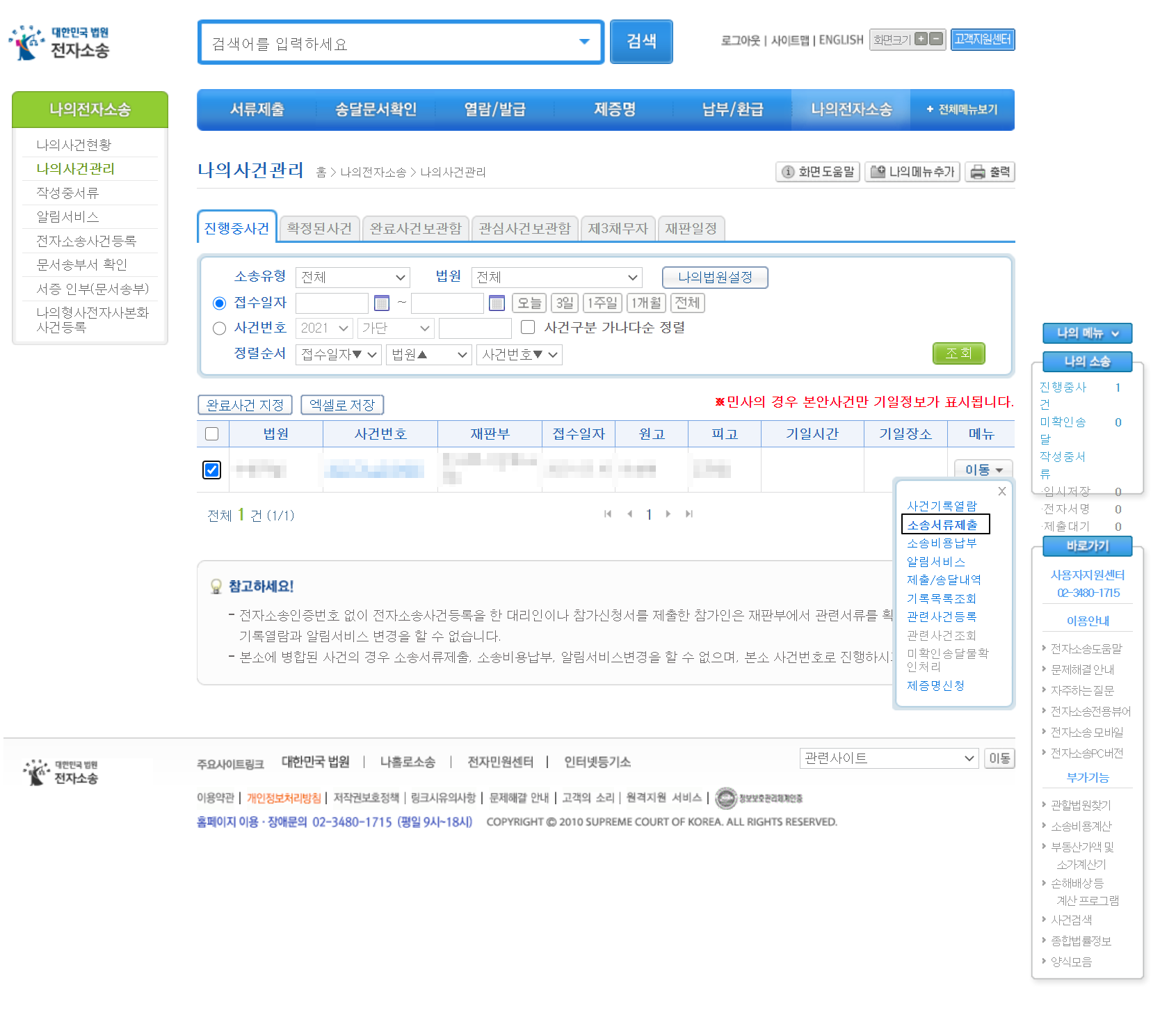 인터넷 전자 소송에서 진행중인 사건을 조회하면 아래와 같이 현재 진행중인 사건에 대한 조회가 가능하다.