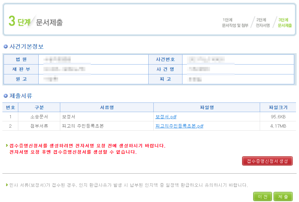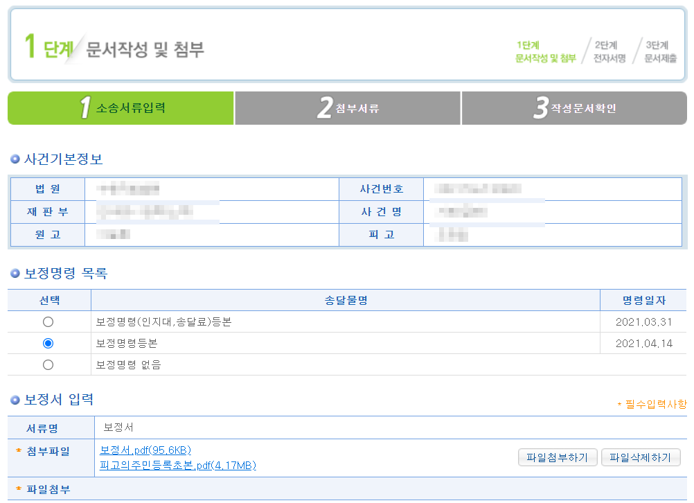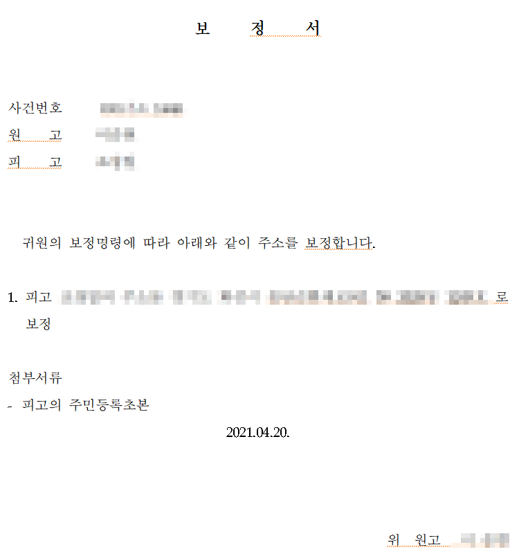제출할 서류는 아래와 같은 양식의 보정서와 피고의 주민등록초본을 스캔하여 첨부하면 된다.