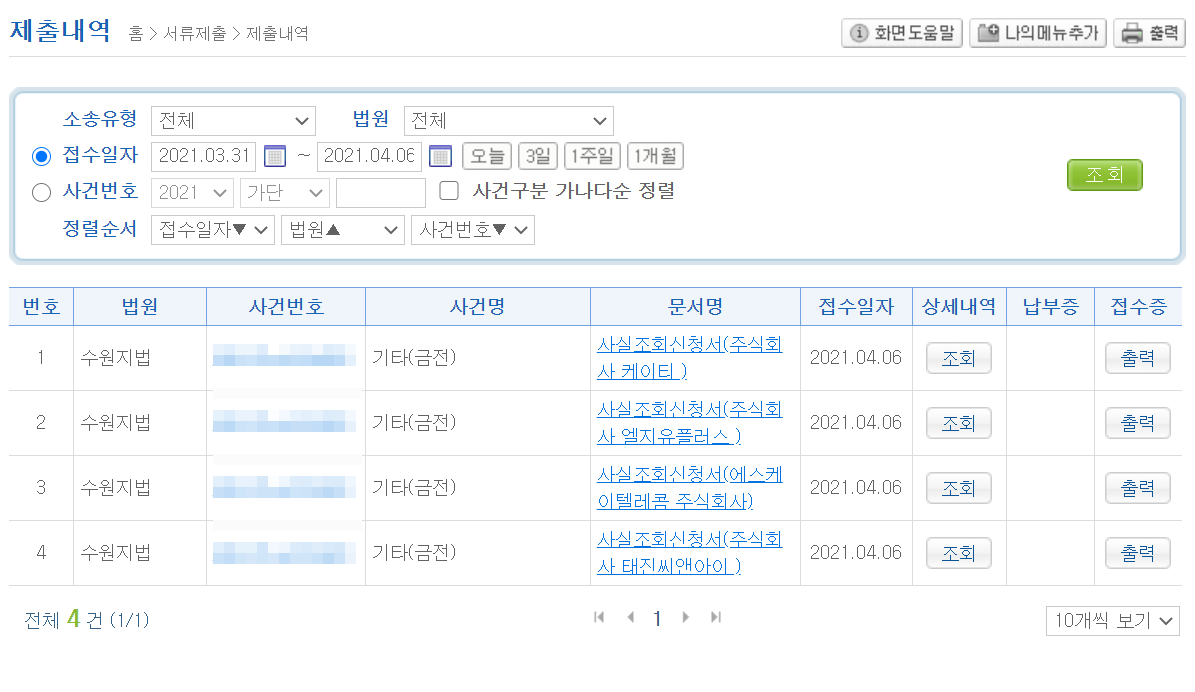 작성이 완료되고 제출하면 아래와 같이 접수내역을 확인할 수 있습니다.