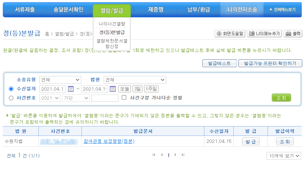 정본발급은 사이트 상단 메뉴중 열람/발급에서 정본 발급을 선택하여 문서를 출력할 수 있다. 반드시 여기서 발급하여 서류를 제출해야 초본 발급이 가능하다. 이 문서는 출력시 법원마크와 문서번호가 같이 발급되기 때문이다.