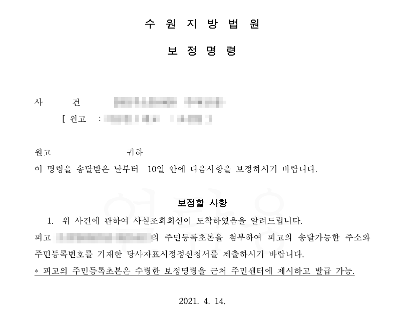 보정명령등본의 내용은 아래와 같다. 법원에서 피고의 주민등록초본을 발급할 수 있도록 공신력있는 문서를 보내준 것이다. 따라서 이 문서를 가지고 주민센터를 방문하여 피고의 현재 주소가 있는 초본을 발급할 수 있다. 다만 현재 이 문서는 열람용이므로 이 문서를 가져가서는 발급할 수 없고 정본을 출력해서 가져가야 한다.