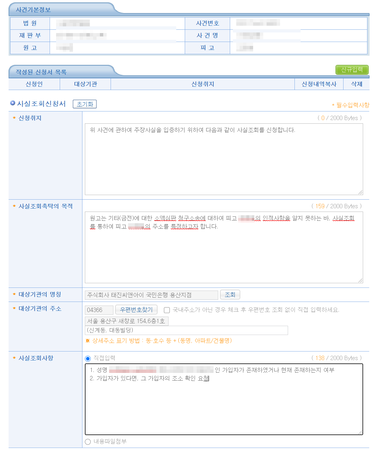 아래와 같이 내용을 작성합니다. 한 사건에 대해서는 최대 10개까지 신청서 작성이 가능하며 작성후 임시저장하고 신규작성을 하면 됩니다.