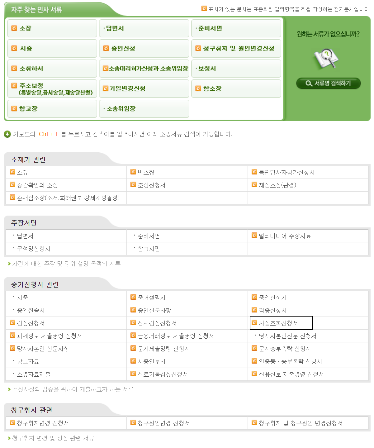 위 사이트는 인터넷으로 소장을 생성할 수 있고 소장은 법원 관할부서로 이관된다. 또한 법원에서 진행되는 과정을 확인할 수 있으며, 법원에서 진행되는 중간에 보정명령이 나오면 그에 따른 진행 업무 수행이 가능한다.