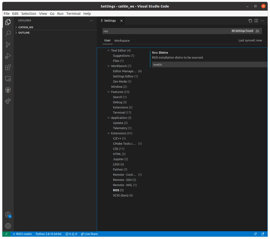 vscode에서 Ctrl+,를 누르면 Setting을 할 수 있는 항목들의 검색창이 나타난다. ROS를 검색하여 자신에게 맞는 distro를 적어준다.