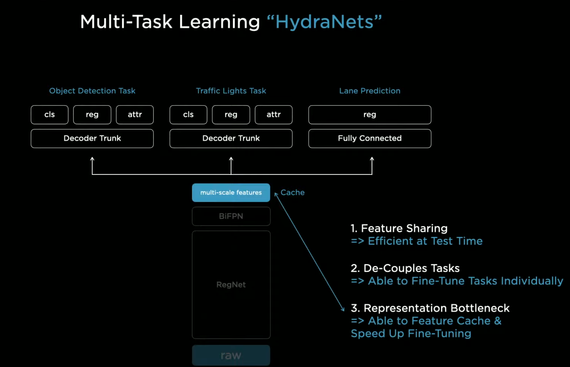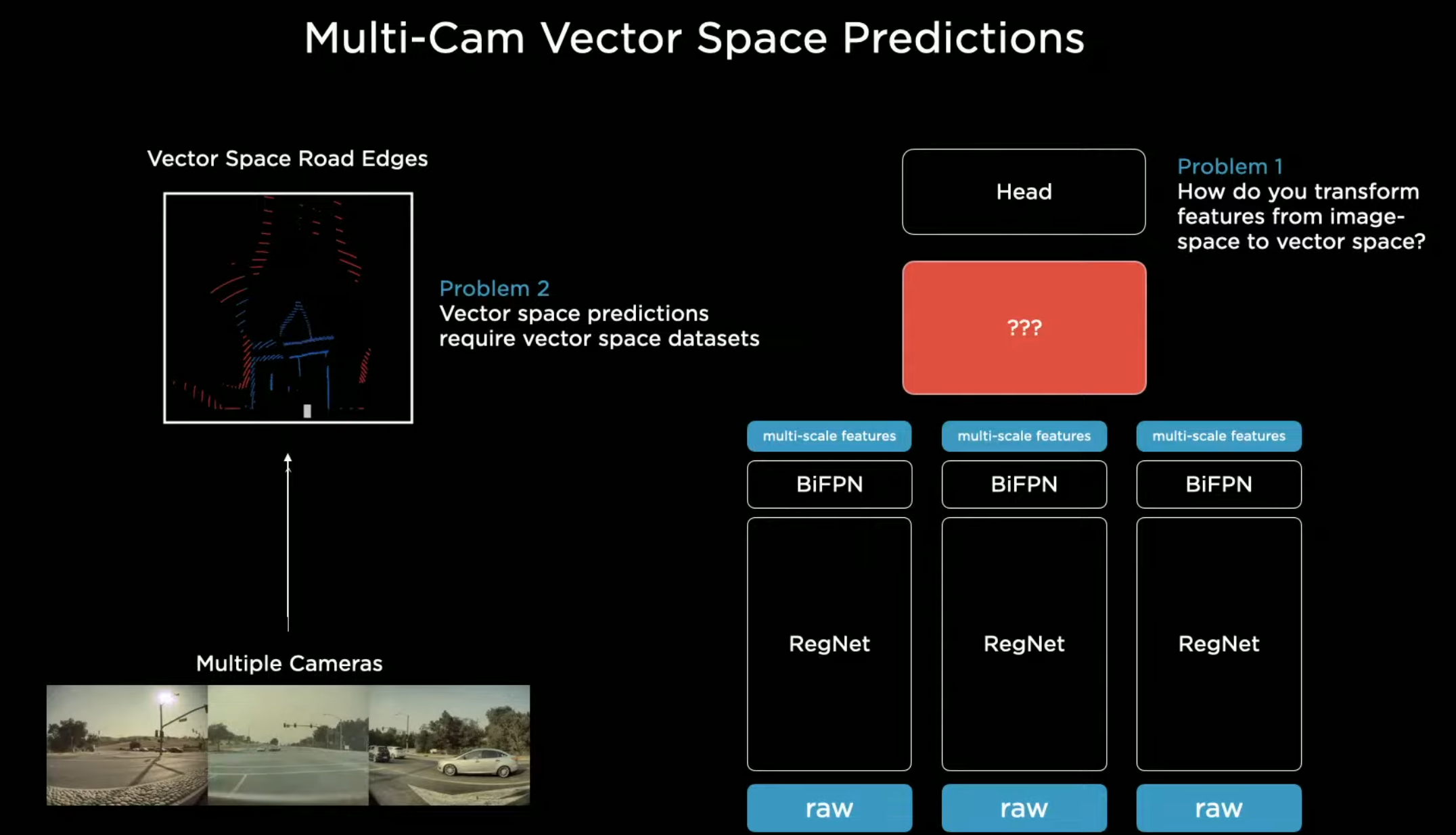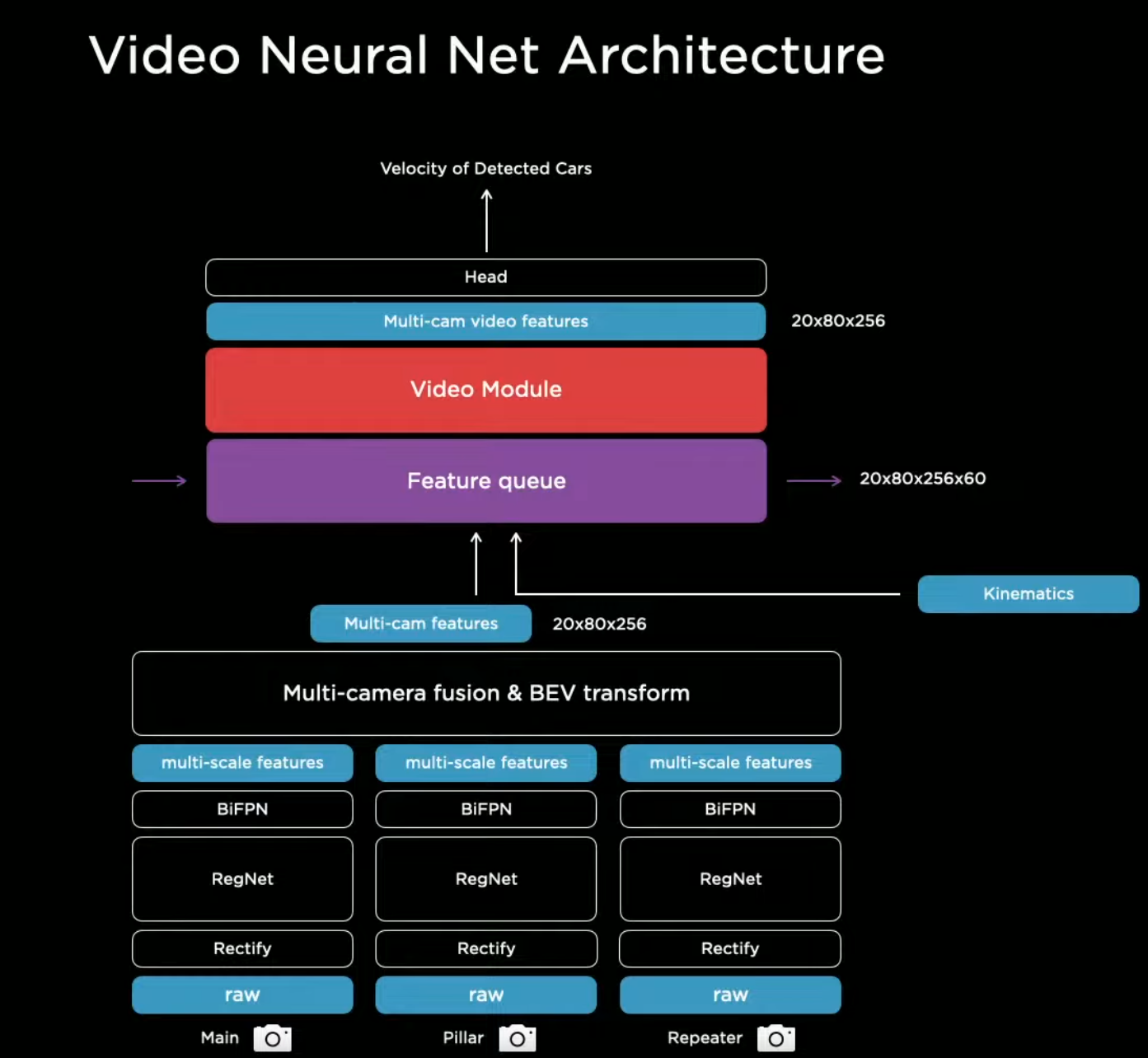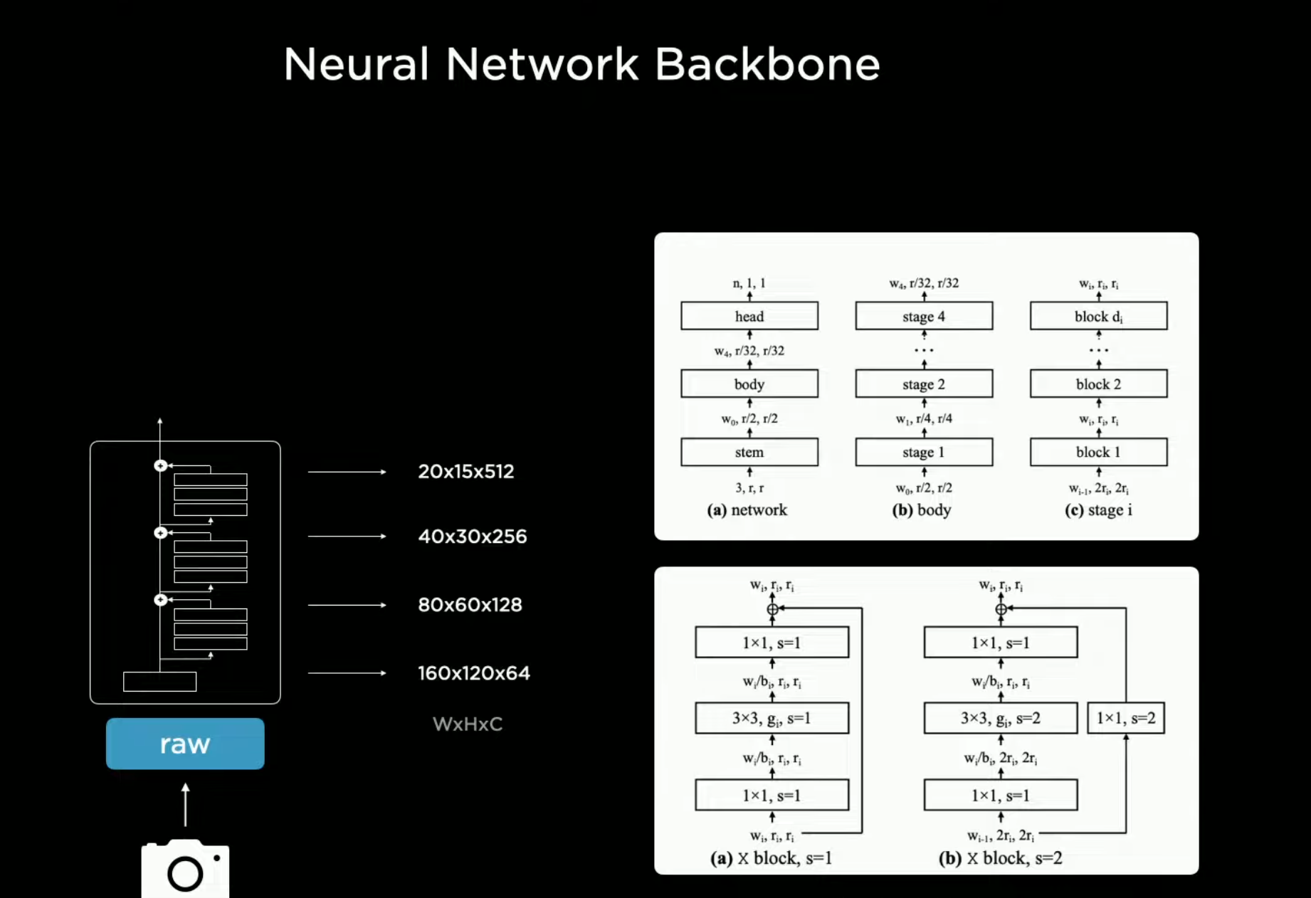 각각의 카메라는 1280x960 해상도의12 비트 raw 이미지를 36Hz 로 스트리밍합니다.raw 이미지는 RegNet을 통하여 작은 타일 형태의 특징정보로 추출이 됩니다. Backbone은 Network 구조에서 가장 많이 사용하고 처리되는 부분을 말하는데요 여기서는 RegNet이 테슬라 Network의 Backbone이 됩니다.