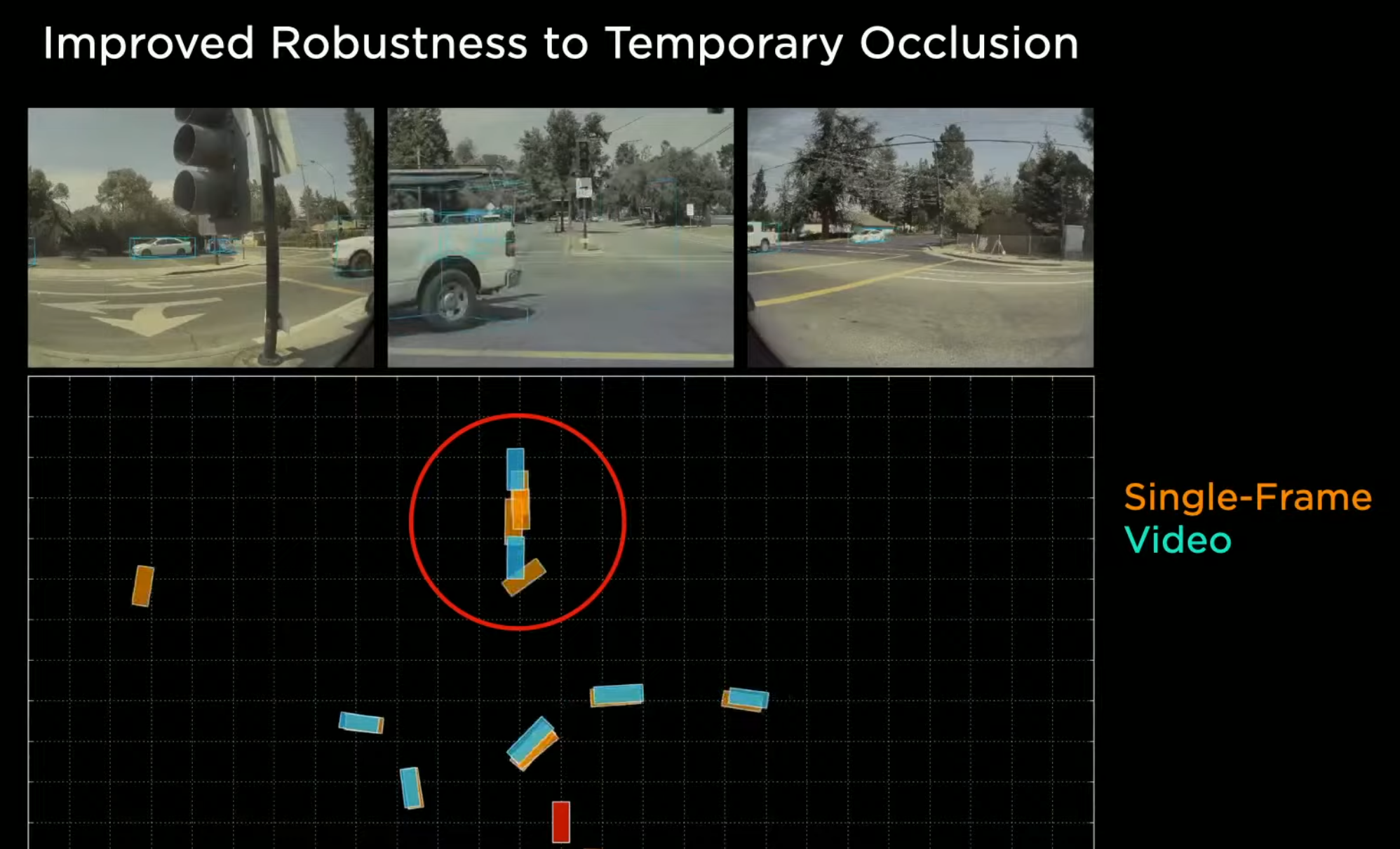싱글 프레임과 비디오 프레임의 비디오 객체 인식 능력을 비교하고 있습니다. 앞쪽에 두대의 차량이 교차로에 있습니다. 앞쪽이 가려지지 않은 상황에서는 싱글 프레임과 비디오 프레임 좋은 인식 성능을 나타냅니다. 하지만 교차로 앞쪽의 다른 차량으로 인해 가려지게 되면 싱글 프레임은 검출을 해내지 못합니다. 그리고 차가 지나가면서 일부가 보이게 되면 예측을 최대한 하려고 하지만 오차가 너무 심하게 나타납니다.