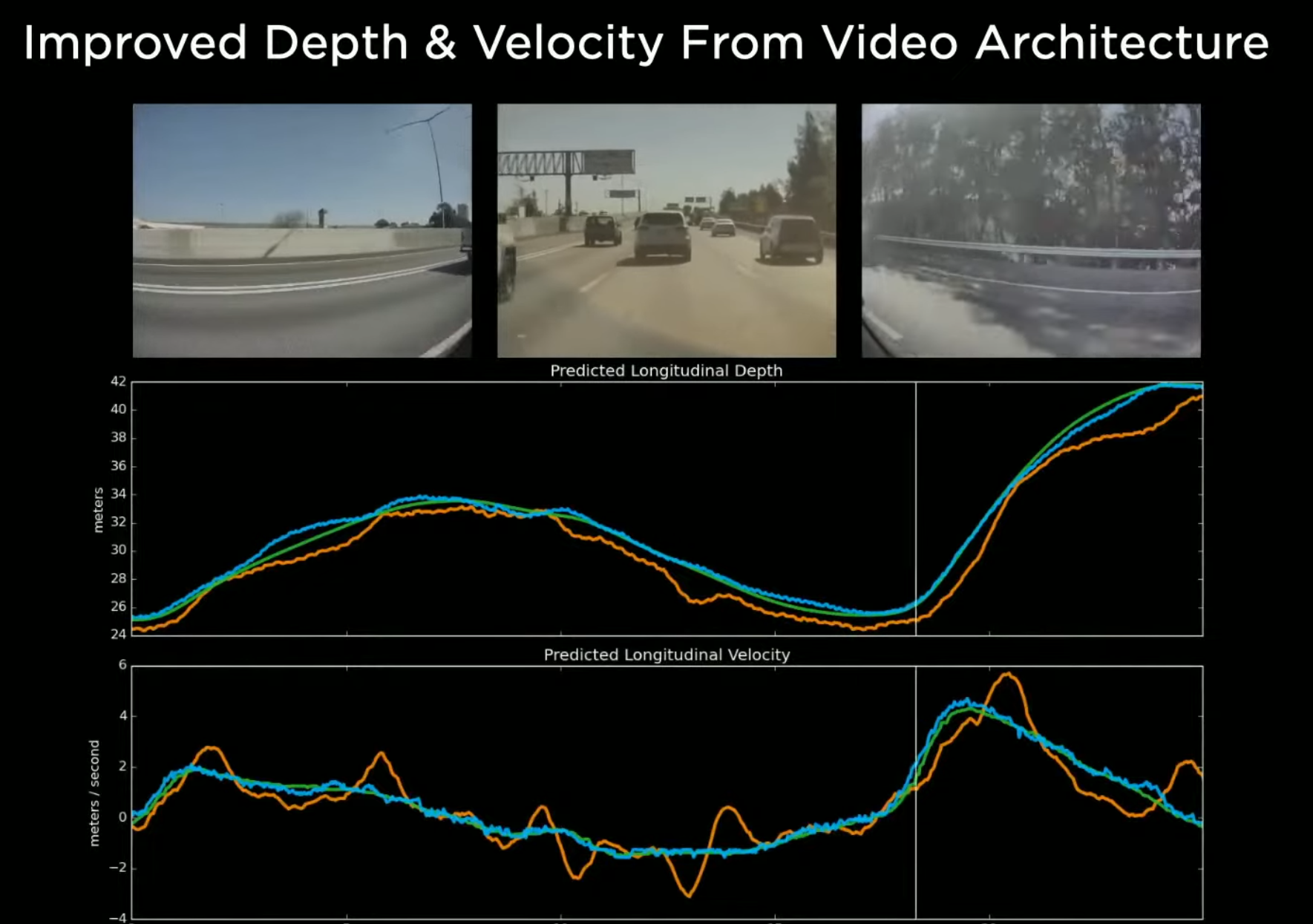 거리와 속도에 대한 인식 능력도 매우 향상되었습니다. 측정하기 위해 레이다를 사용하였습니다. 레이다가 측정한 거리와 속도 값은 녹색입니다. 오렌지색은 싱글 프레임이고, 파란색은 비디오 프레임입니다. 비디오 프레임은 레이다와 동등을 성능을 나타내고 있습니다.