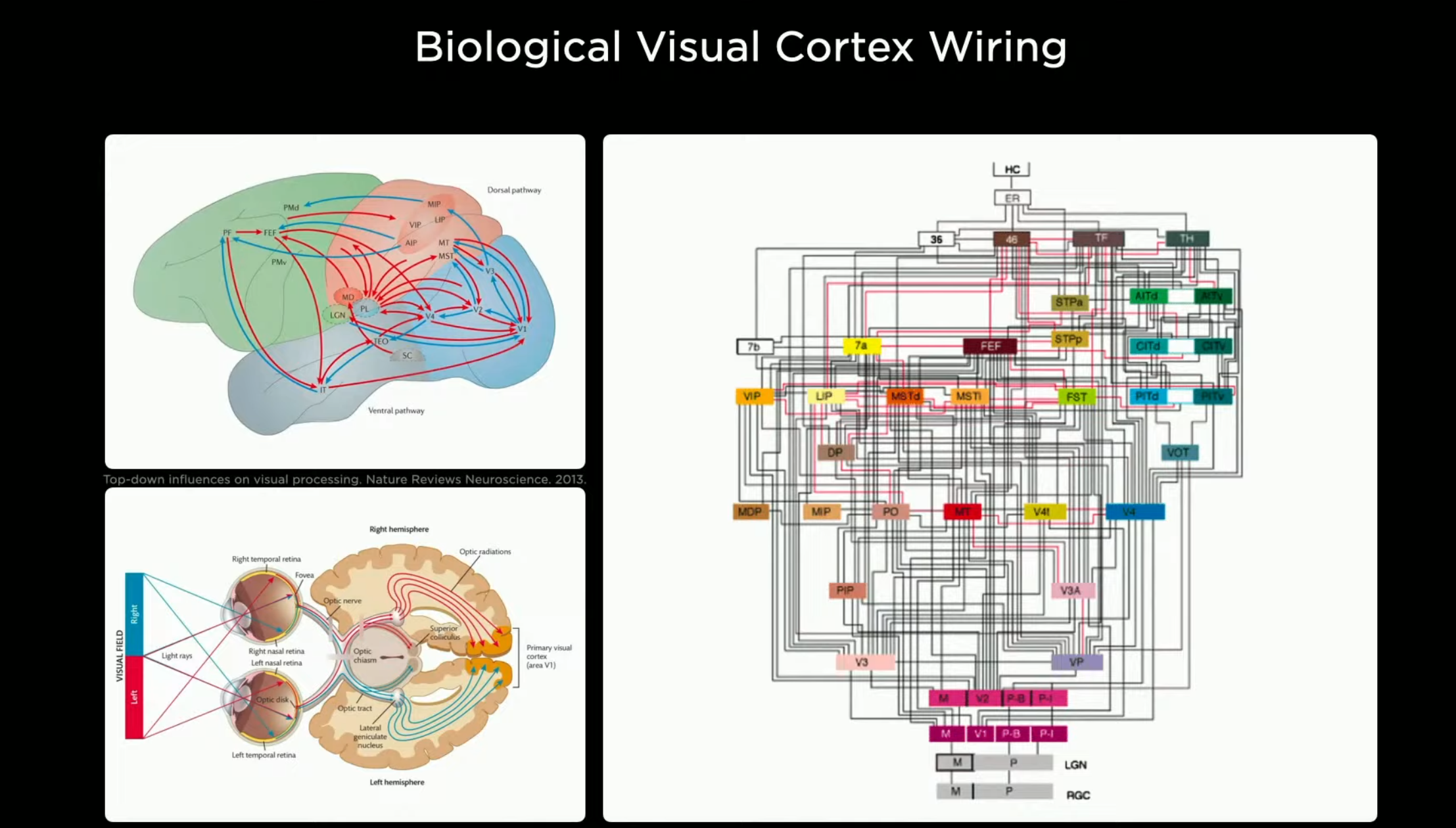 왼쪽에 있는 그림은 인간의 생물학적인 시각처리 매커니즘을 보여주고 있습니다. 빛정보가 망막(Retina)에 닿게 되면 외측슬상액(LGN)을 거쳐 시각피질(Visual Cortex)에 정보가 전달됩니다. 시각피질은 눈으로 들어오는 정보를 체계화하기 위한 시각구조를 가지고 있습니다.