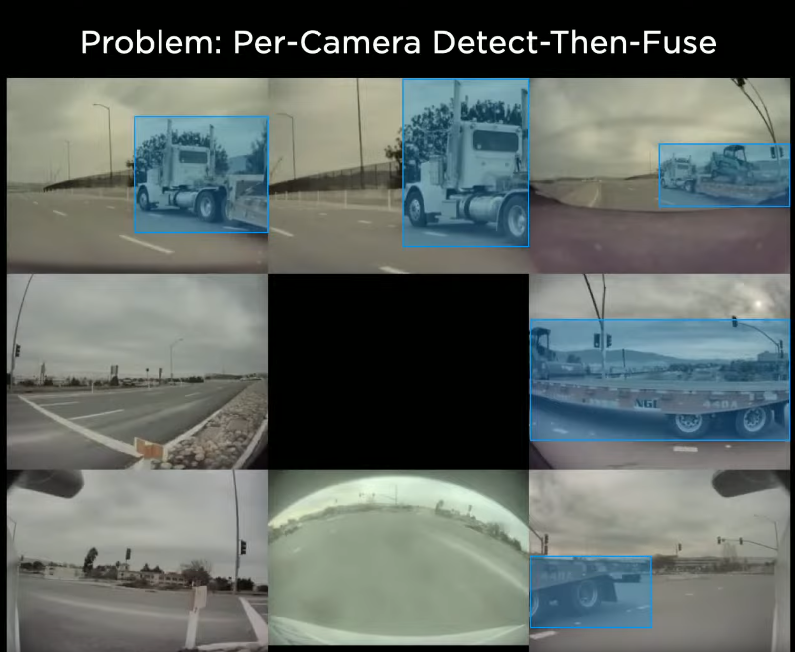 카메라에서 이미지만 사용할 경우 또 한가지 문제는 한 대의 차량이 여러대의 카메라에 나타나면서 다른 차량으로 인식할 수 있습니니다. 아래 영상에서 트럭이 5개의 카메라에 서로 다른 모습으로 나타나게 되는데 카메라가 차량 전체를 다 볼 수 없기 때문에 서로 다른 차량으로 인식할 수 있습니다.