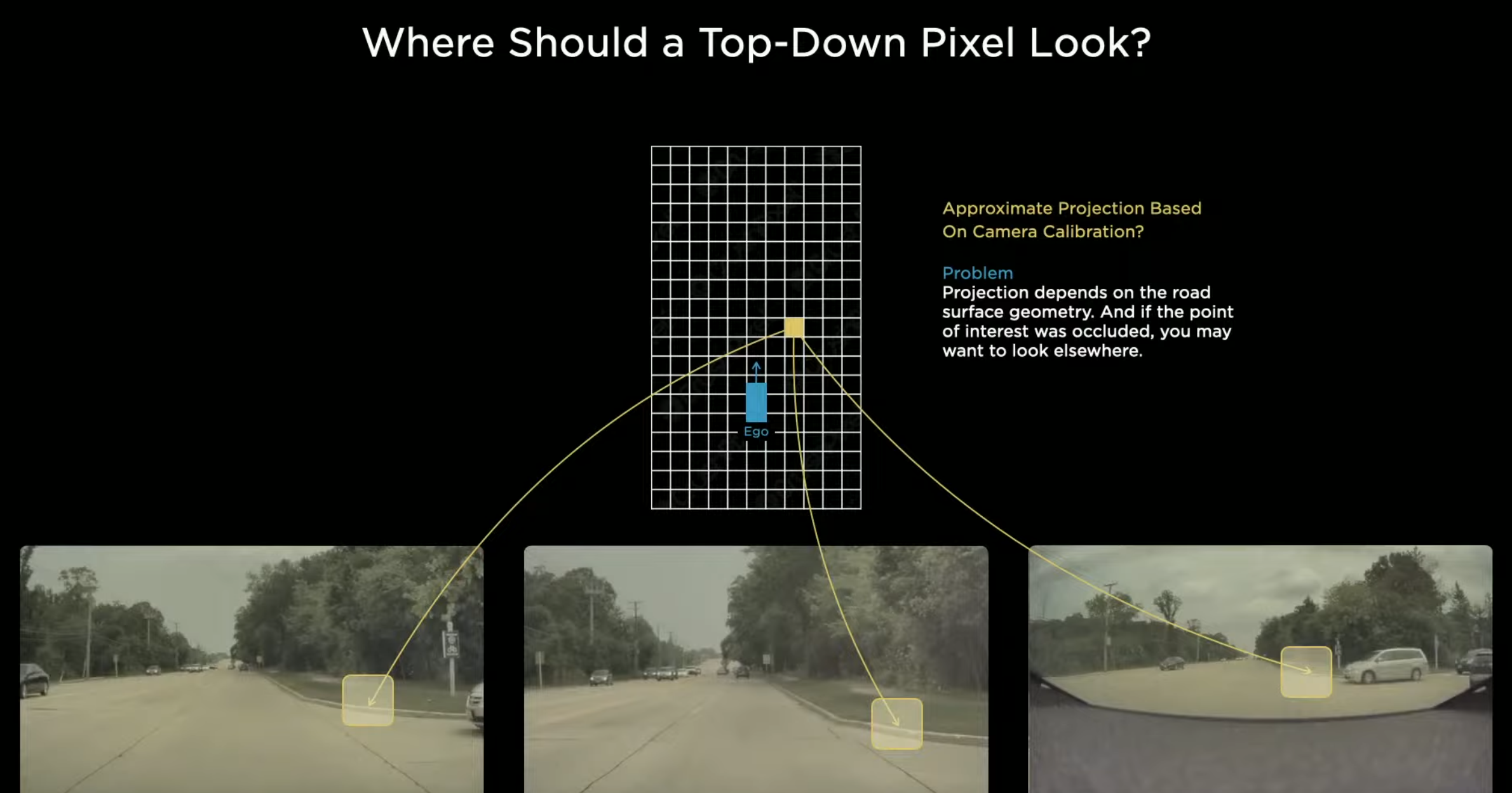 아래 그림은 카메라의 영상을 기반으로 버드 아이뷰를 구성한 것입니다. 버드 아이뷰에서 노란색 픽셀은 각 카메라의 영상에서 어디에 해당될까요? 이 노란색 블럭은 실제로는 영상에서 커브에 있는 일부를 가지고 온 것입니다. 카메라의 물리적인 위치와 내/외부 파라미터를 알고 있으면 대략적으로 위치 추정은 가능합니다만 프로젝션이 정확하게 이루어지지 못하면 정확한 위치를 알 수 없습니다 . 그리고 이것인 커브인지 아닌지도 판단하기는 어렵습니다. 주변에 있는 도로는 선형적인데다가 도로면 경사가 오르막이나 내리막일 수도 있습니다. 데이터 자체의 오차때문에서 판단이 어려울수도 있고 다른 차가 지나가면서 가려지기만 해도 판단은 어렵게 됩니다.