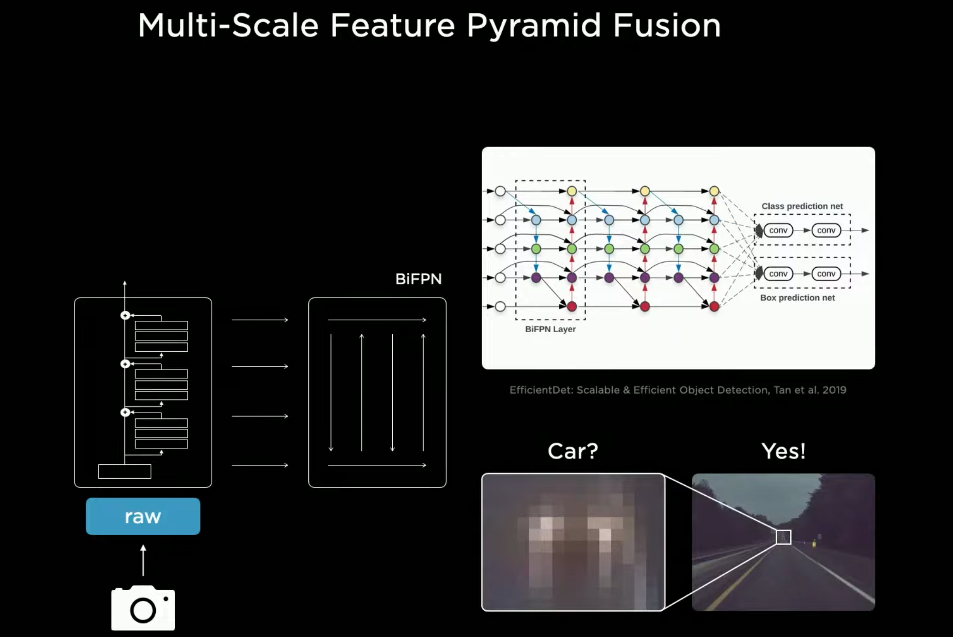 다음은 BiFPN(Bi-directional Feature Pyramid Network)에서 여러장의 피라미드 이미지를 형성하여 멀티 스케일의 특징정보를 처리합니다. BiFPN은 테슬라 Netowk 구조에서 Neck 부분에 해당됩니다. 멀티 스케일 처리가 왜 필요한지 물으신다면 현실세계에서 물체의 크기는 동일하지만 사람의 시각처리 메커니즘처럼 카메라를 통하여 입력받는 영상은 크기가 다양합니다. 따라서 크기가 작은 물체를 검출하기 위해서는 낮은 스케일의 이미지에서 여러가지 특징들을 보다 섬세하게 찾아볼 수 있습니다. 반면 높은 스케일의 이미지에서는 넓은 시야각의 이미지를 처리하게 되므로 전체 내용을 큰 맥락에서 판단할 수 있습니다.