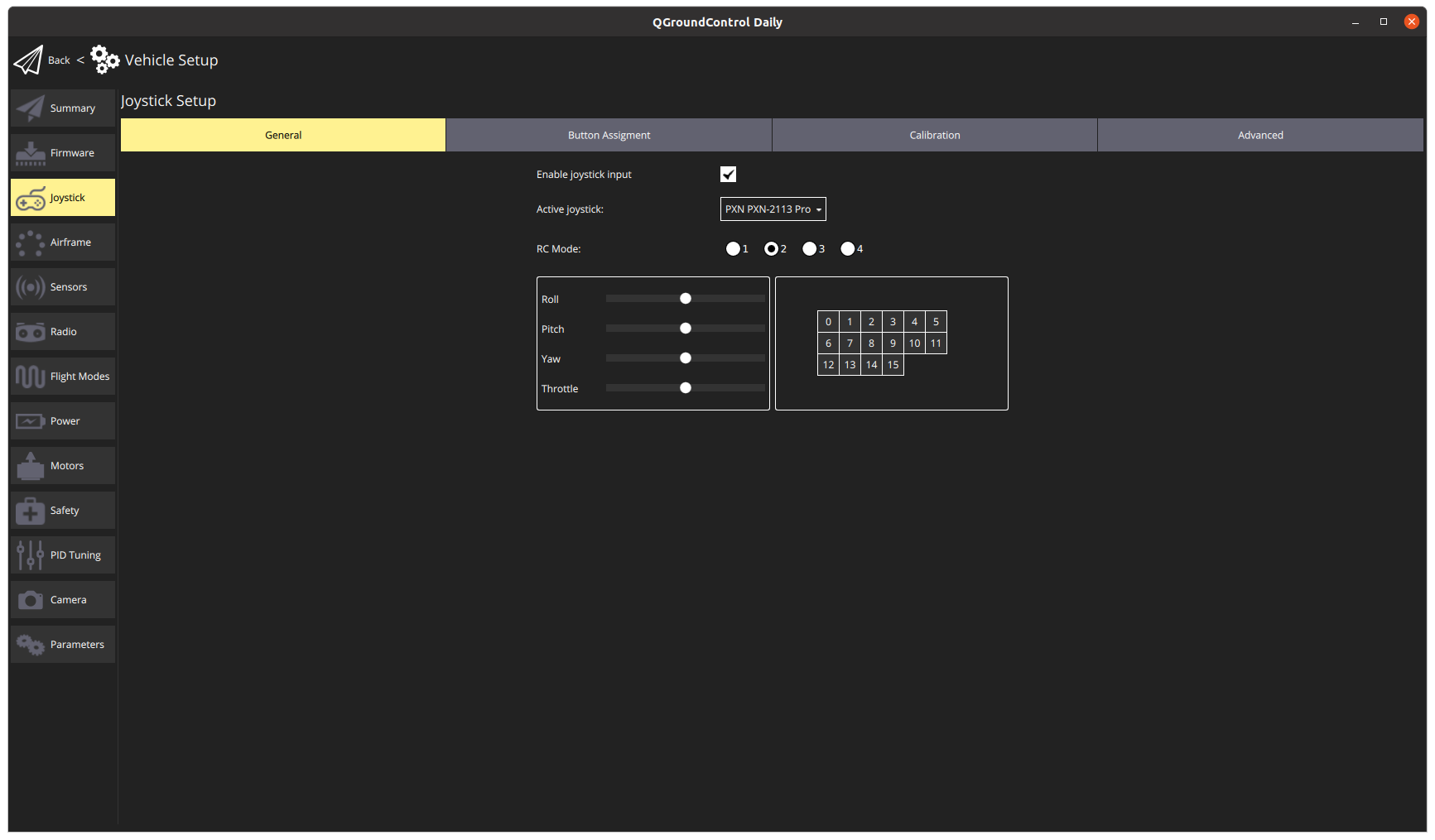 조이스틱의 USB를 연결하고 QGRoundControl에서 Vehicle Setup에 들어가면 Joystick이 자동으로 활성화됩니다. 자동으로 조이스틱의 모델이 인식됩니다. RC Mode는 조종기의 모드를 말합니다. 보통 요즘에는 모드2를 많이 사용하므로 모드2로 선택하였습니다.