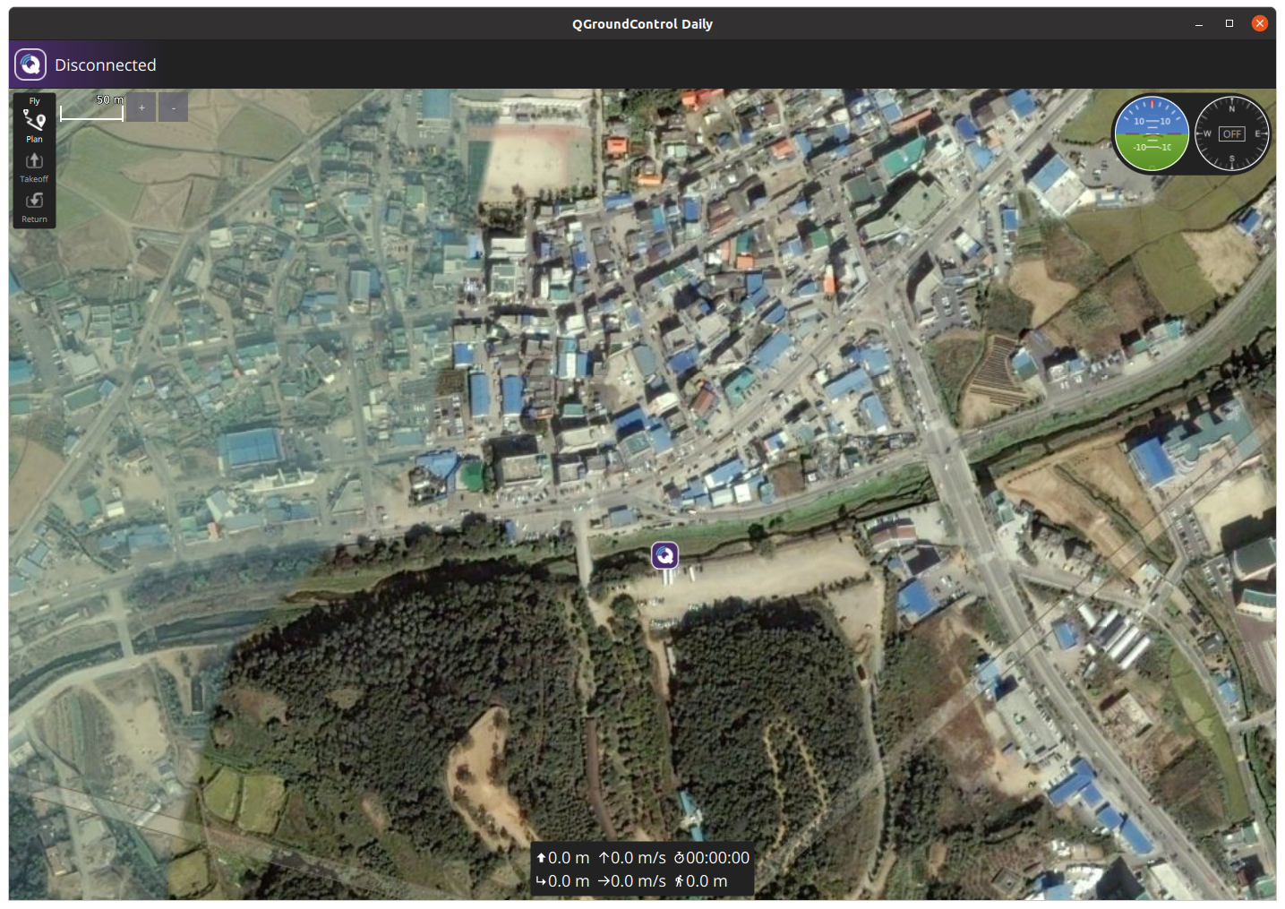 QGroundControl이 실행되면 아래와 같은 화면이 나타납니다. 아직 PX4 SITL과 연결이 되지 않았기 때문에 왼쪽 윗 모서리에Disconnected라고 표시됩니다.