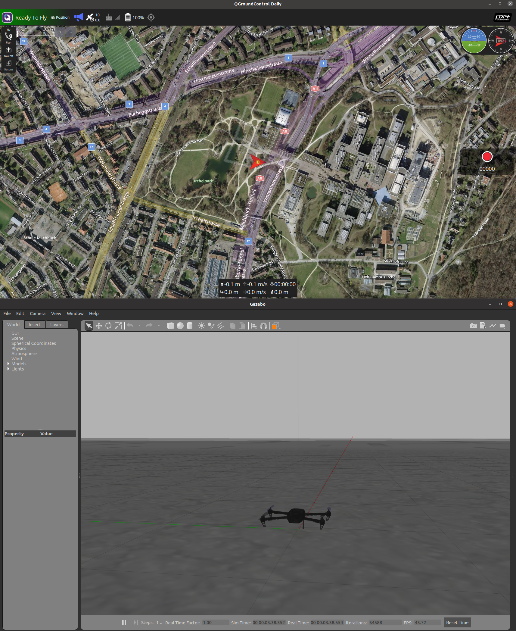 Gazebo에서 드론이 takeoff하여 position hold상태가 되어 있는 것을 볼 수 있습니다.