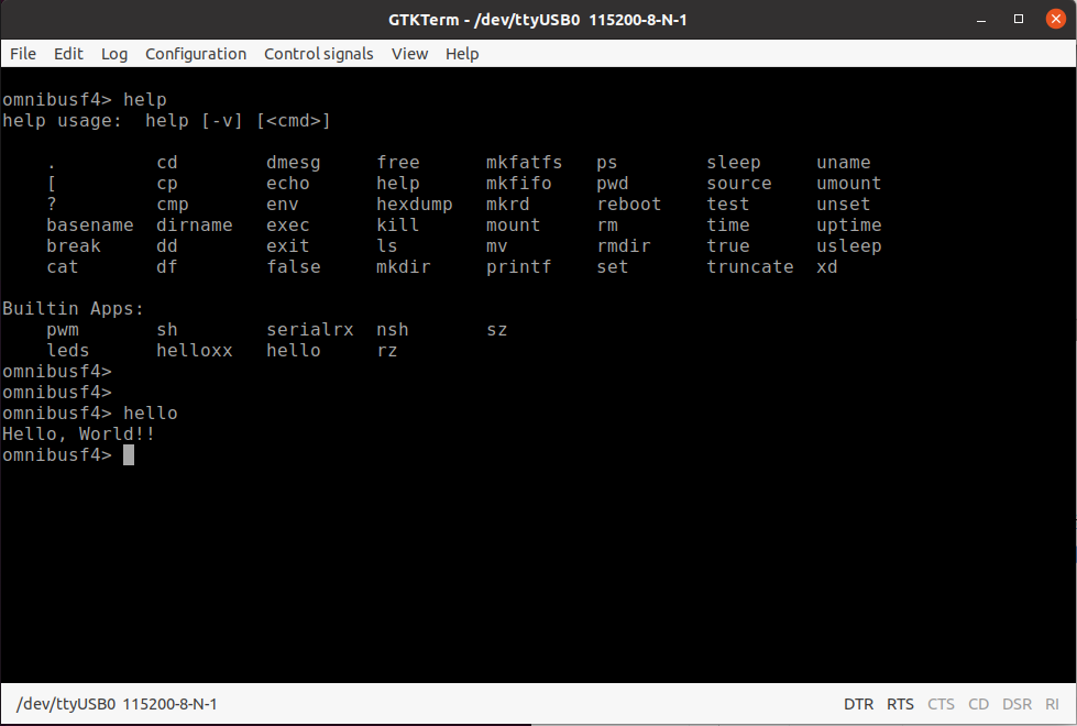 - 엔터를 치면 아래와 같이 nuttx에서 프롬프트가 나타난다.