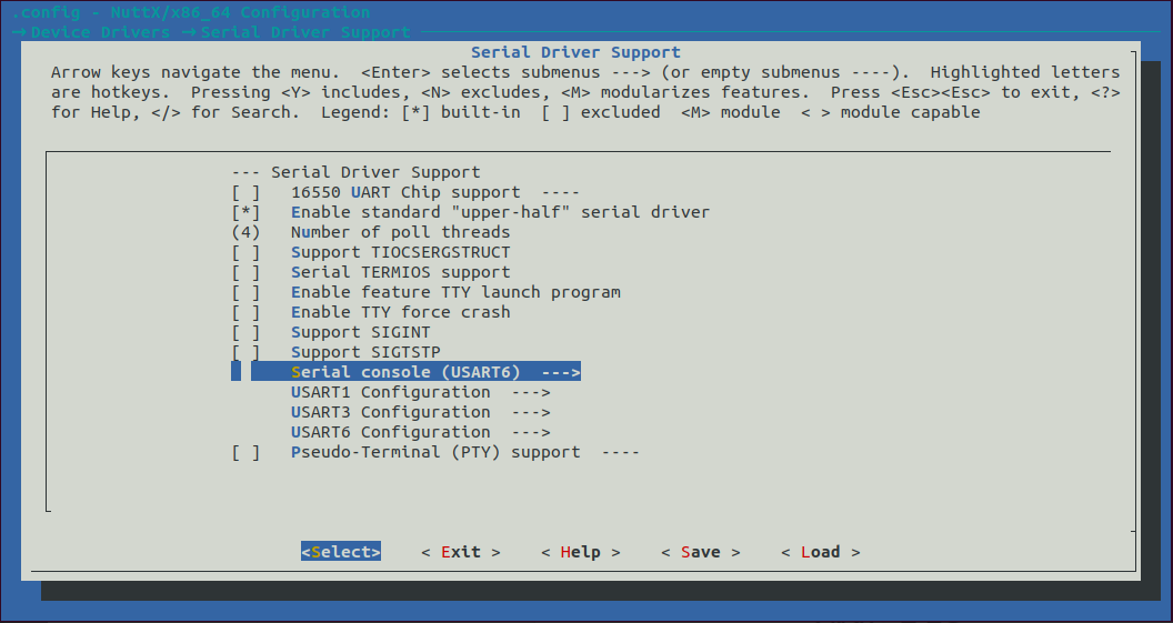 - 메뉴에서 Device drivers-> Serial driver support 를 선택하면 아래 화면이 나타난다. 메뉴중 Serial console을 USART6로 변경한다.