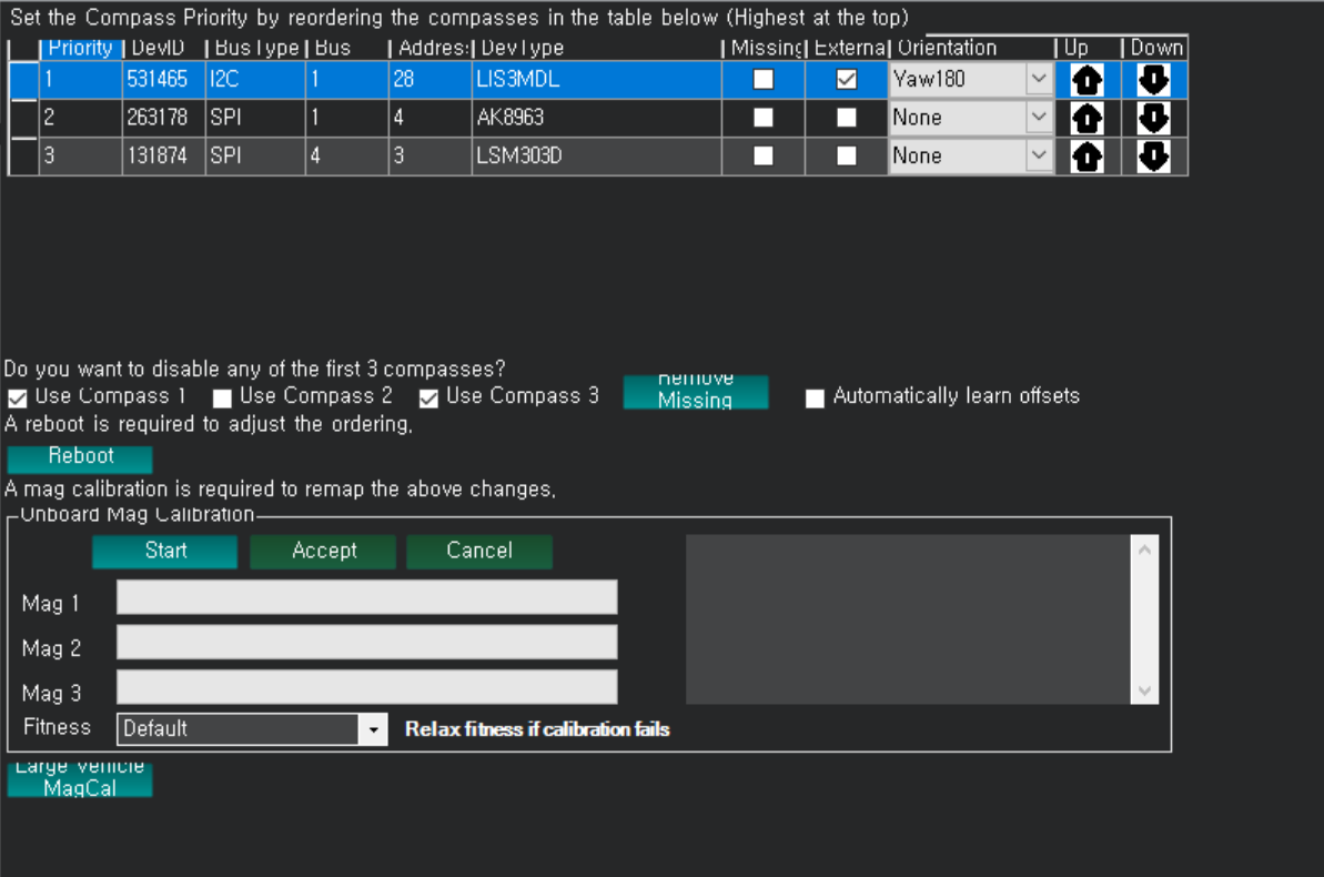 - 외부는 LIS3MDL 센서를 사용함, 외부센서는 180도 회전되어 설치되어 있으므로 Orientation Yaw180 적용해주어야 함