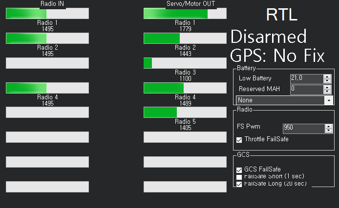 - Q_ESC_CAL=1, Q_SPIN_MIN=0, PREARM_CHECK = 0, Rudder로 Armming할 수 있도록 수정으로 수정