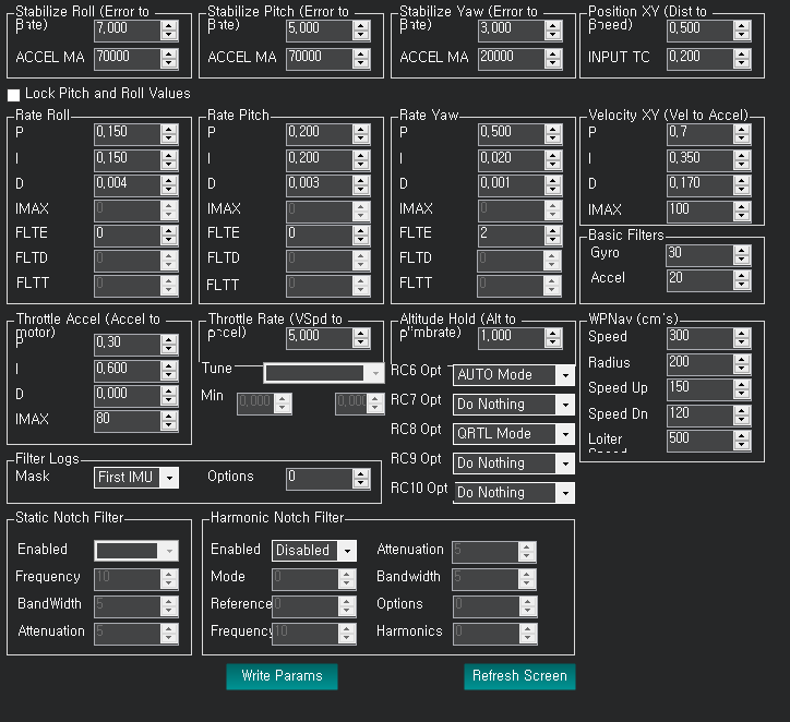 사시나물 떨리듯한 동작은 PID 게인중 Roll 게인값을 아래와 같이 조절해주면 개선된다.