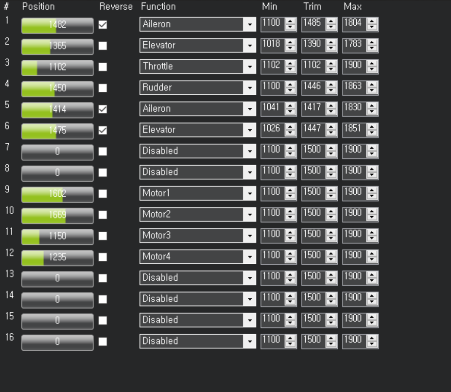 - Rudder +방향(조종기의 Rudder키를 오른쪽)으로 전환시 1,2번 모터 출력이 3,4번보다 높아야 함