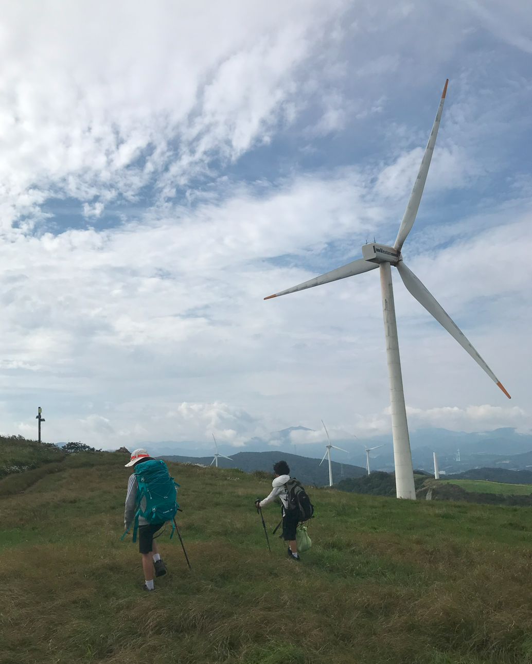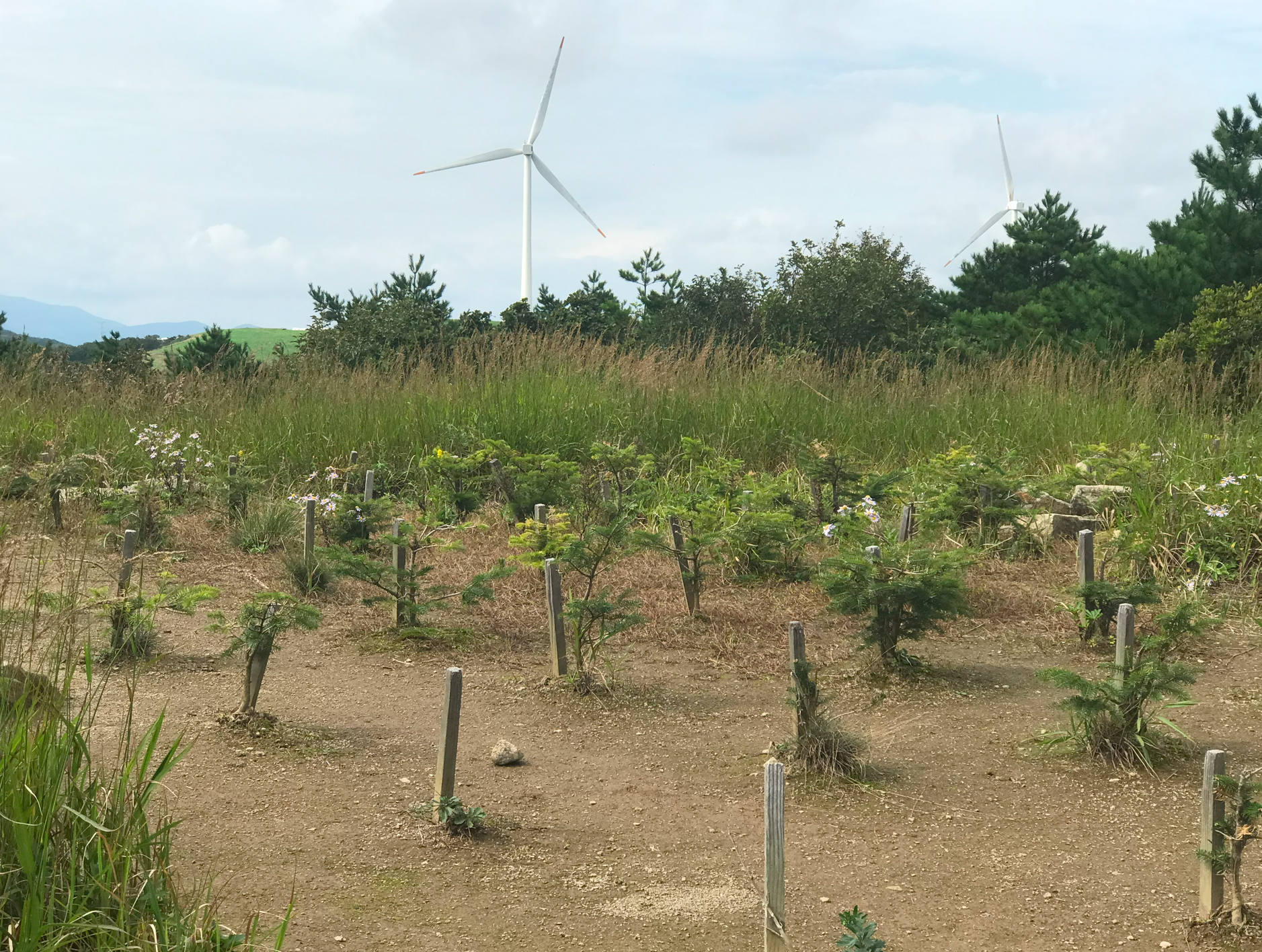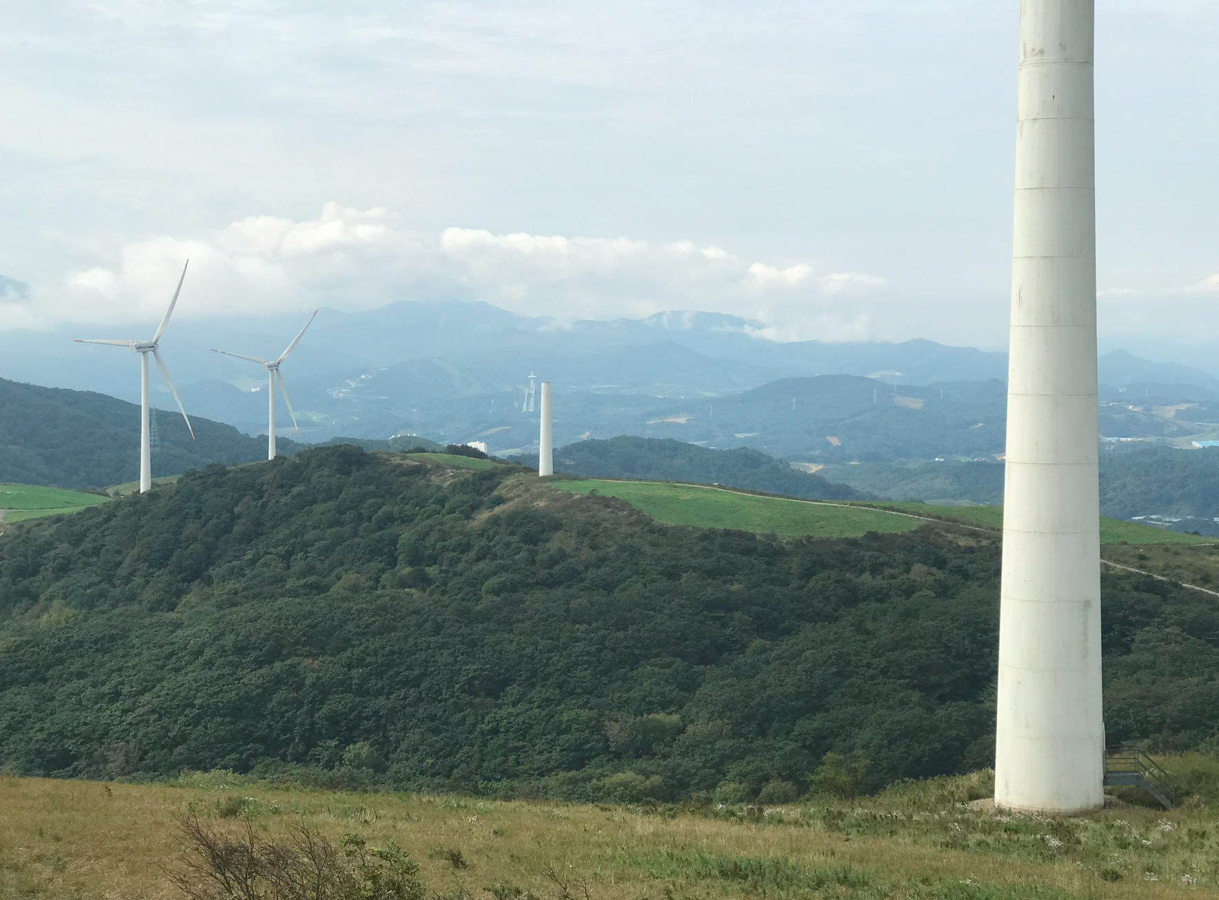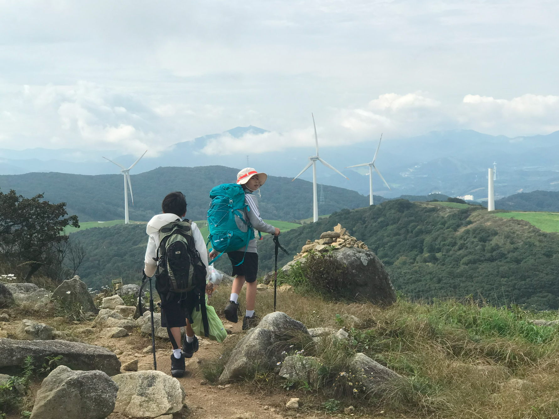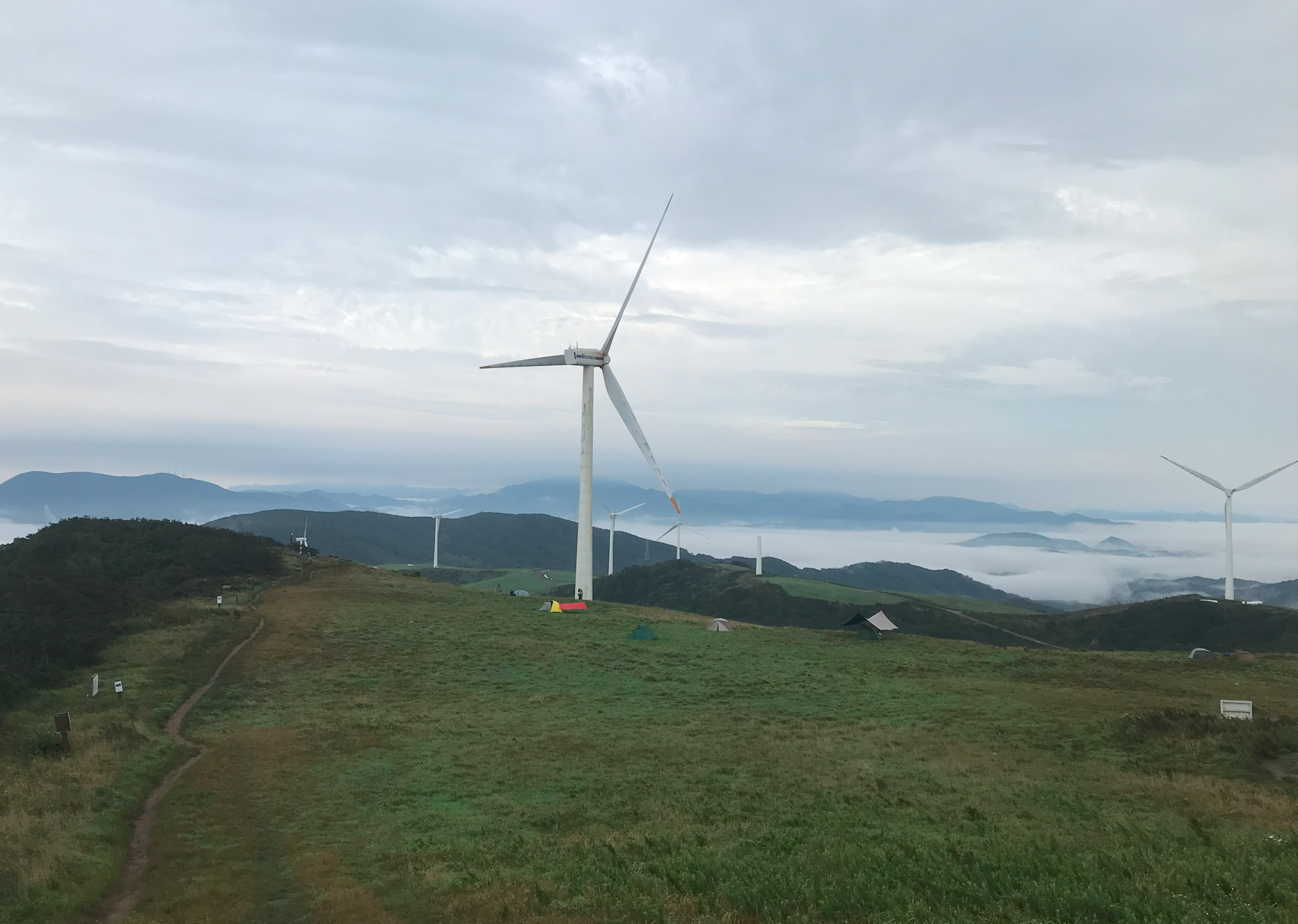 약 한시간 반에 걸쳐 올라온 정상은 정말 장관이었다 굴업도와 비슷한 언덕위로 펼쳐진 초원 분위기와 압도적이 크기의 웅장한 픙력 발전시스템에 멋진 장관을 이루었다.