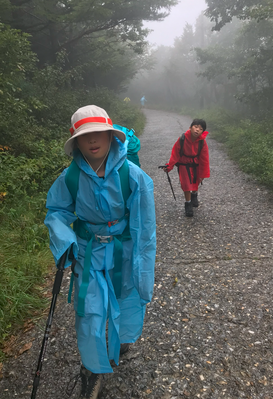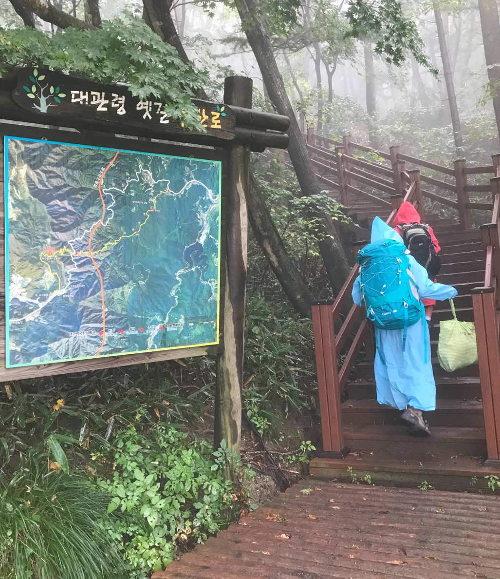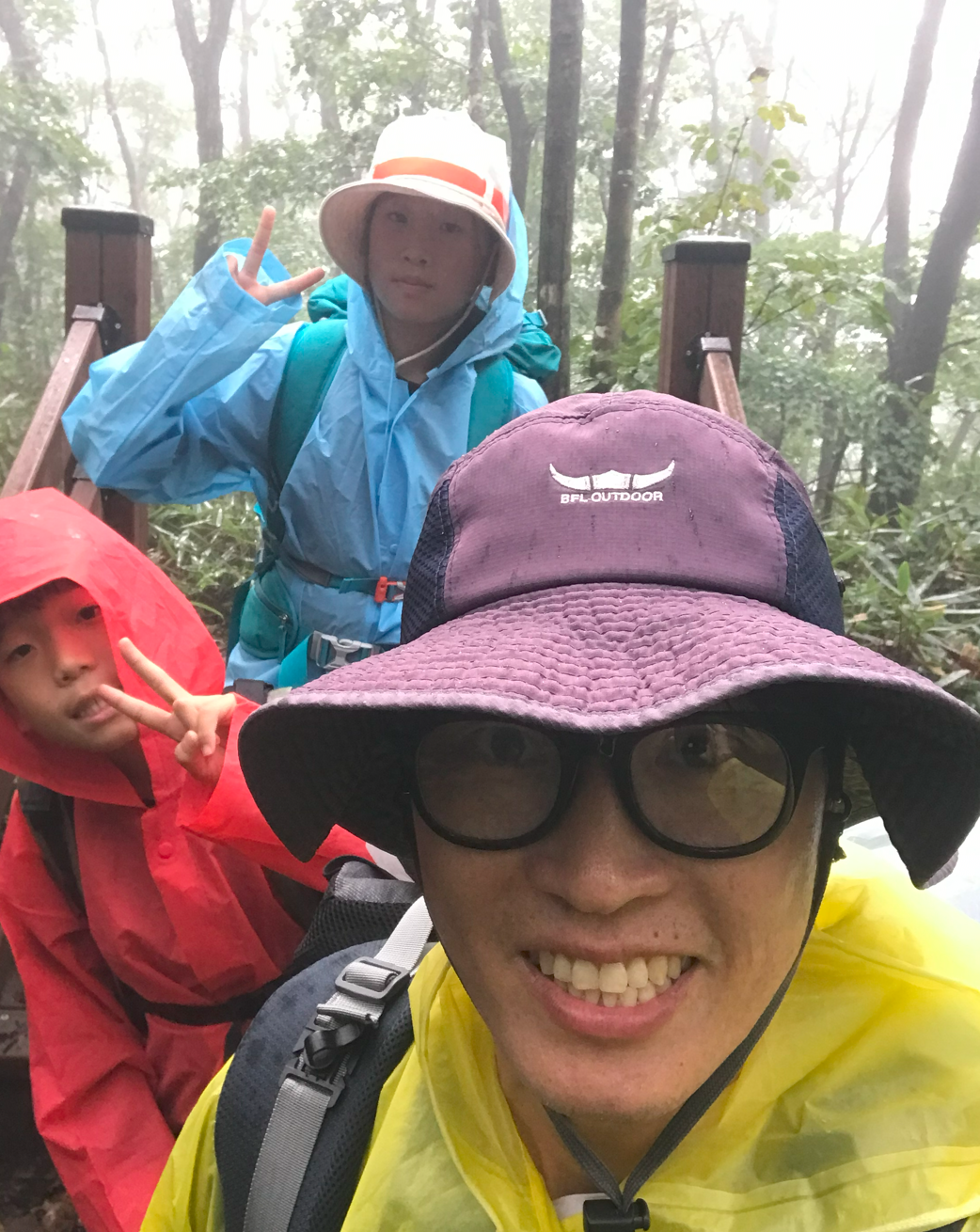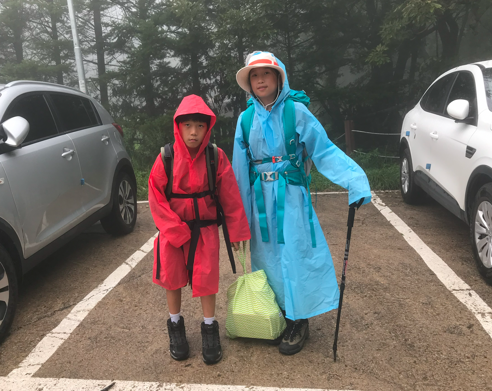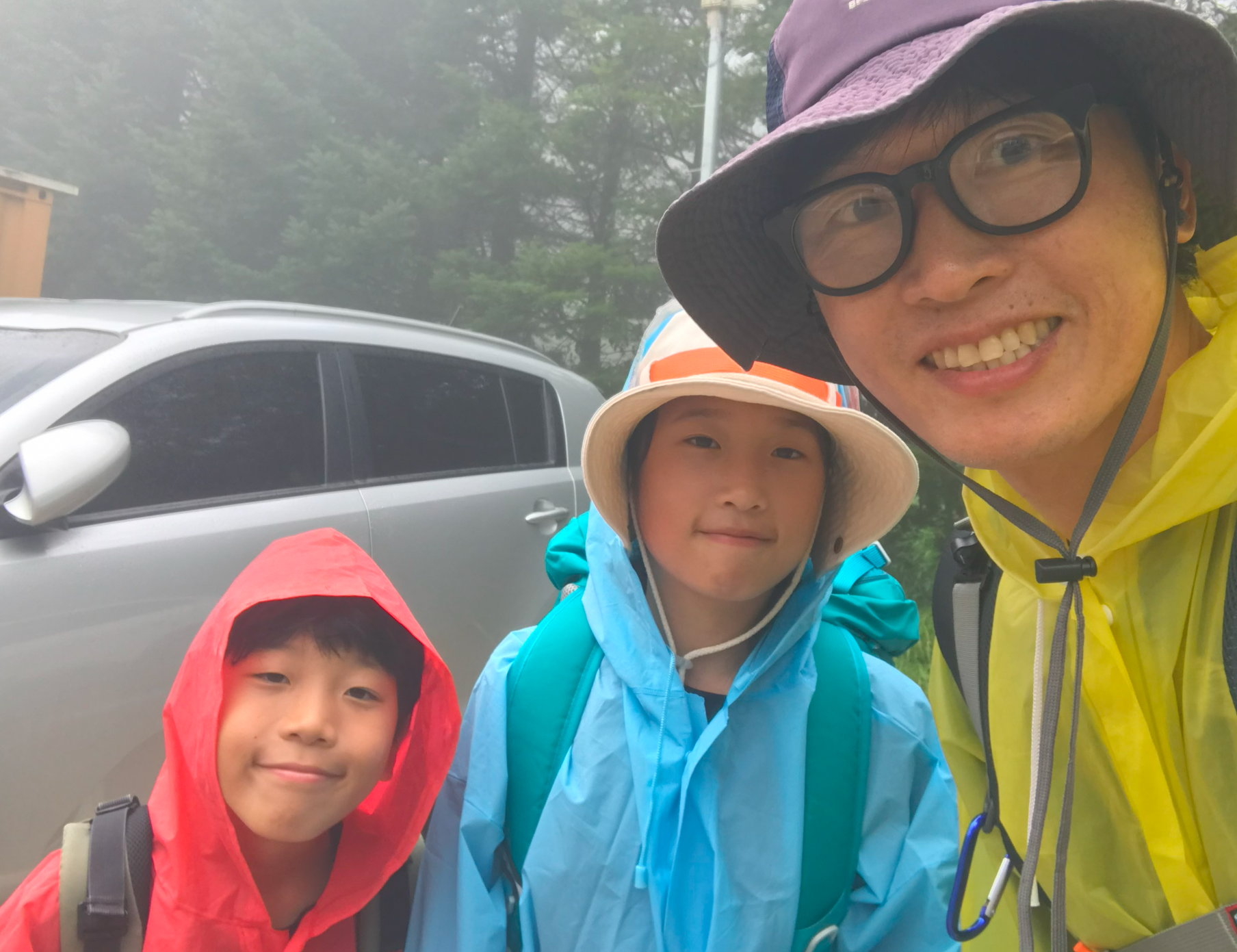 도착지에 차를 주차하고 우비부터 챙겨입었다. 아이들 모두 가방 하나씩 짊어지고 올라가는데 기방 무게를 가볍게 한다고 했지만 이것 저것 챙기다보니 짐이 많아져서 우비를 입은채로 손에 짐도 짊어지고 올라가게 되었다. 모든 산행준비를 마치고 산행던 기념 촬영을 했다 이제 드디어 시작이다.