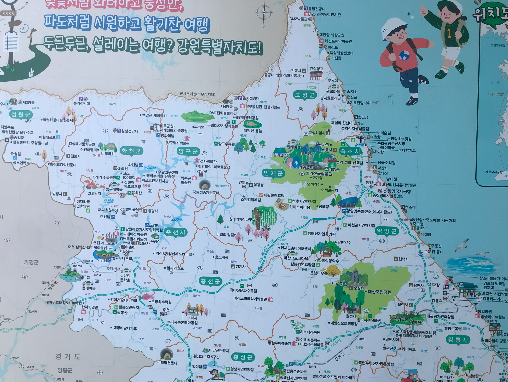 30분 정도 달리다가 문막휴게소에 잠시 들렀다. 휴게소 앞에는 강원도의 다양한 여행지가 안내되어 있다. 역시 강원도는 가볼만한 곳이 많구만~! 아이들과 함께 가볼만한 곳이 많아 보인다.