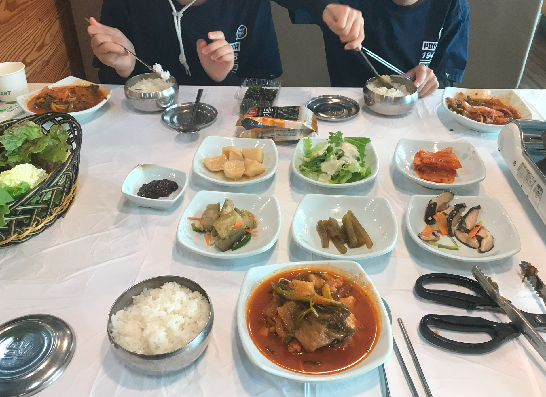 아이들한테는 조금 매울거라고는 헸는데 보니 우리가 생각한 두루치기 요리가 아니고 찌개같이 끓여서 먹는 음식이었다 마치 술인주같은… 그런데 은진이가 쪽파가 너무 맛있다고 잘먹었다 의진이는 맵지 읺고 밋있다고 잘먹는다 의진이는 고기 공략, 은진이는 쪽파 공략…