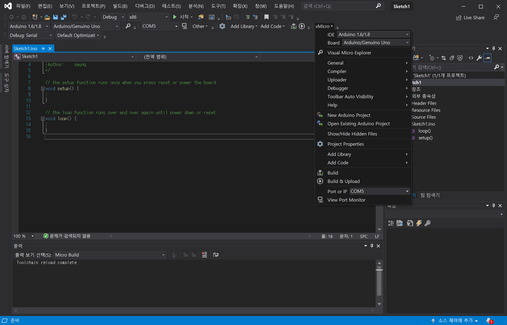 VisualStudio를 실행하고 Empty Project를 생성하면 아래와 같이 vMicro라고 새로운 메뉴가 생긴다. Arduino 관련 설정, 프로젝트 관리, Library 설치, 빌드 및 실행은 이 메뉴에서 다 해결할 수 있다.