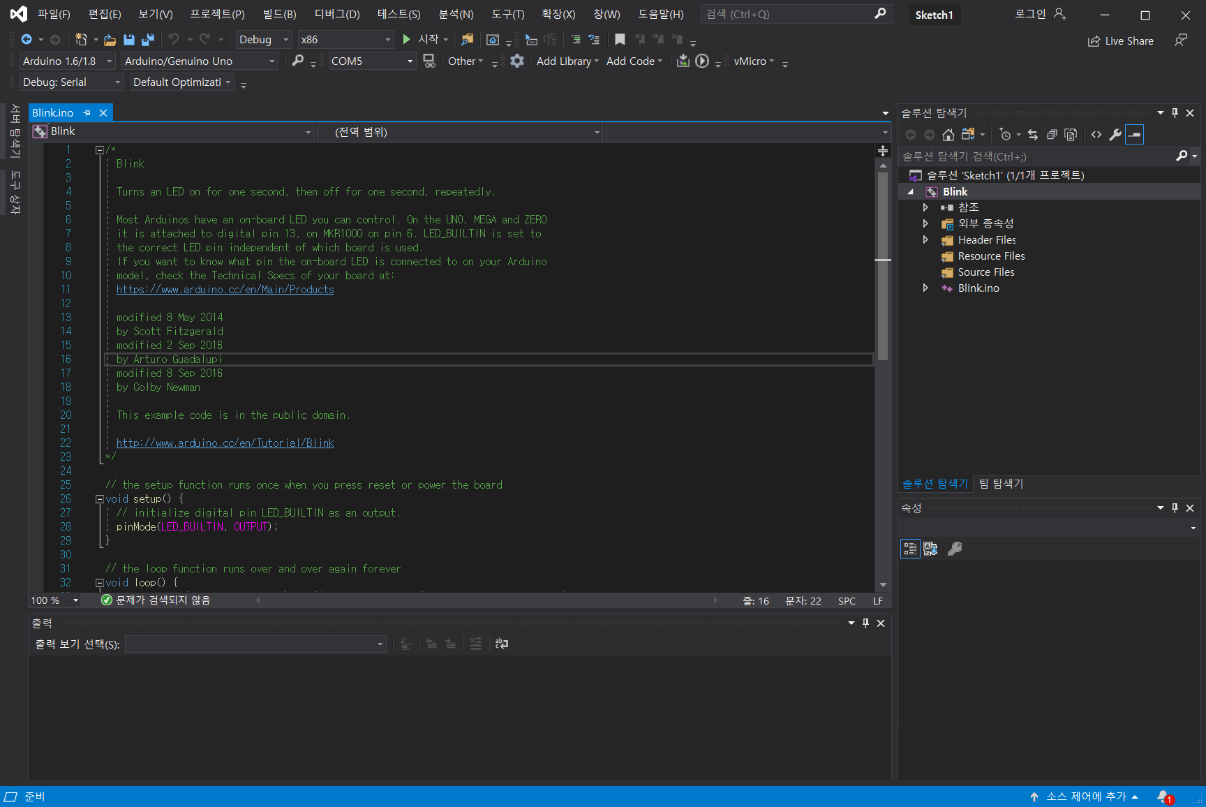 blink 예제가 프로젝트에 로딩되면 아래와 같이 blink.ino 파일을 불러온다.