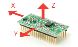 - 3축으로 되어 있으며 가속도 센서의 각 축의 방향은 아래 그림과 같다. 오른손 법칙에서 검지(x축), 중지(y축), 엄지(z축)으로 나타낼 수 있다. 빨간색으로 표시된 부분이 + 방향이다.