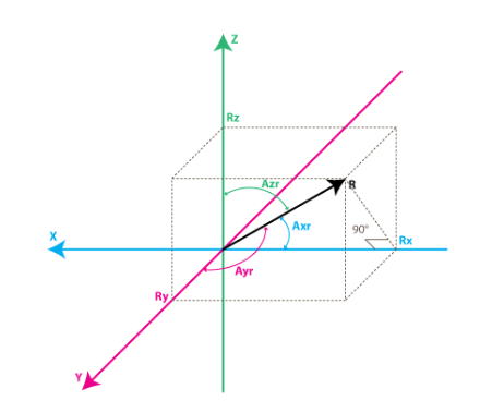 각 축의 각도는 Vector R을 기준으로 각 축으로 프로젝션된 값 Rx, Ry, Rz값의 arccos값이다.