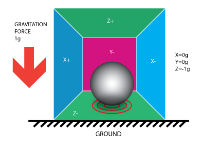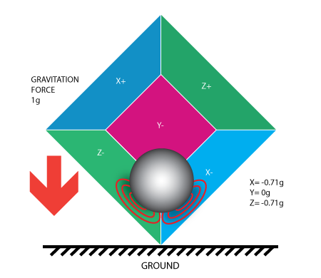 지구에서는 1g(9.8㎨) 만큼의 중력이 바닦을 향하고 있으므로 Z축 방향으로 -1g의 값을 가지게 된다.