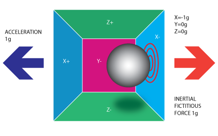 갑자기 상자를 X축 방향으로 1g 만큼 당기게 되면 관성에 의해서 당기는 쪽과 반대방향으로 1g만큼의 힘을 받게 된다.