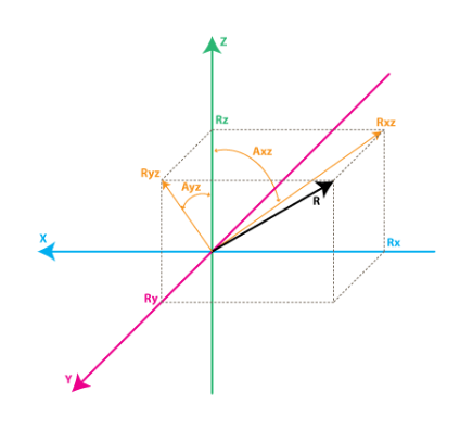 Z축과 Rxz사이의 각도를 Axz, Z축과 Ryz사이의 각도를 Ayz라 하자.