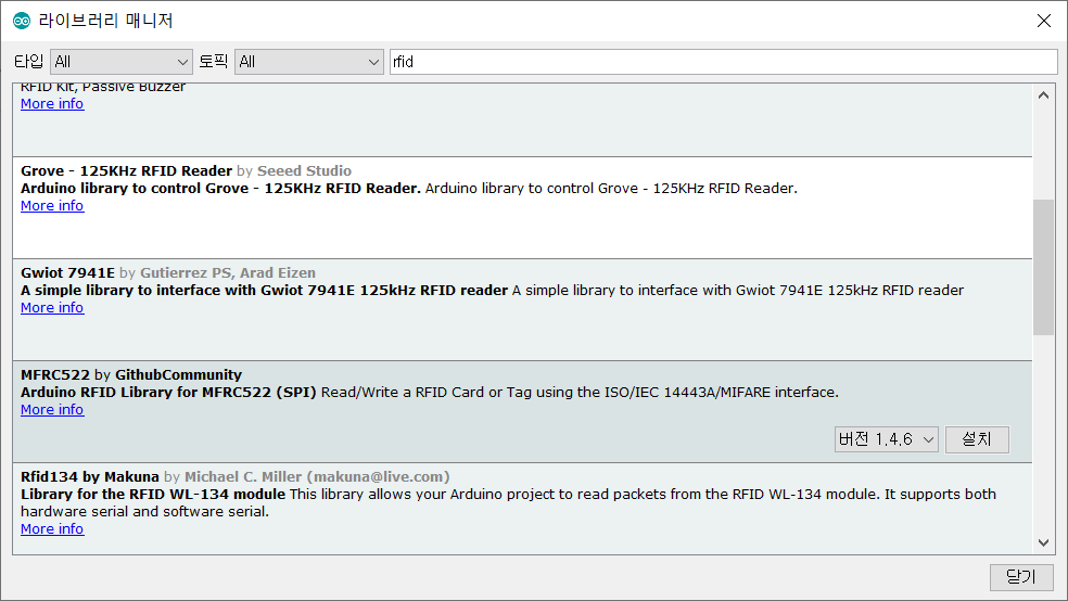 라이브러리 관리에서 RFID를 검색하면 'MFR522 by GithubCommunity' 라이브러리를 찾을 수 있고, 이 라이브러리를 설치한다.