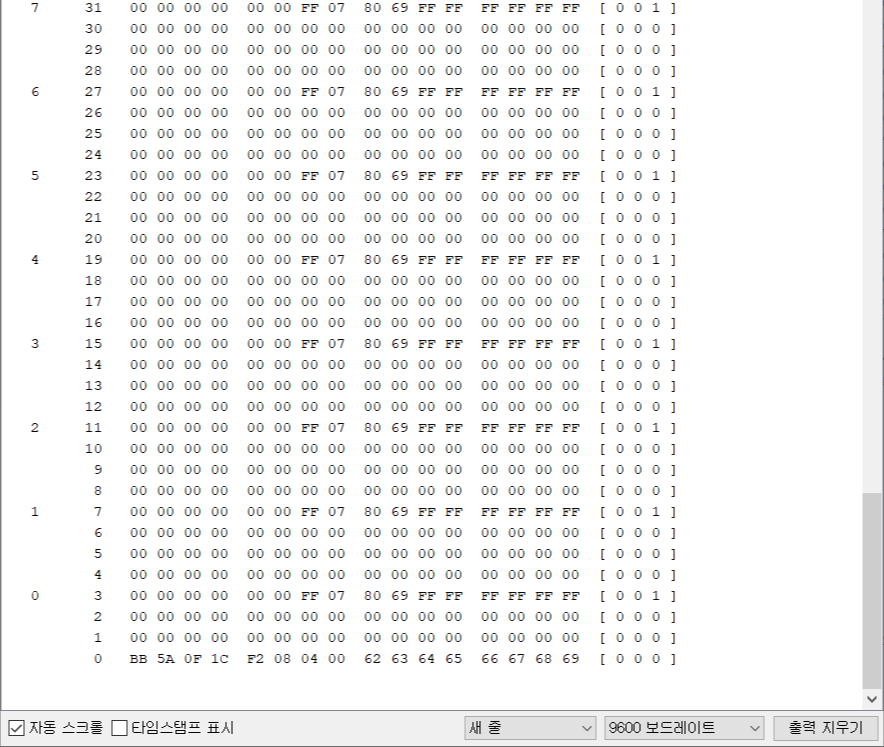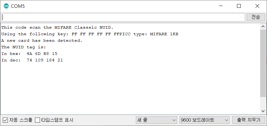 RFID는 ID값을 내부 EEPROM에 기록하는데 기록되어 있는 정보를 Dump해서 볼수가 있다. 예제에서 Dumpinfo를 업로드하고 시리얼 모니터를 실행하면 아래와 같은 결과를 얻을 수 있다.