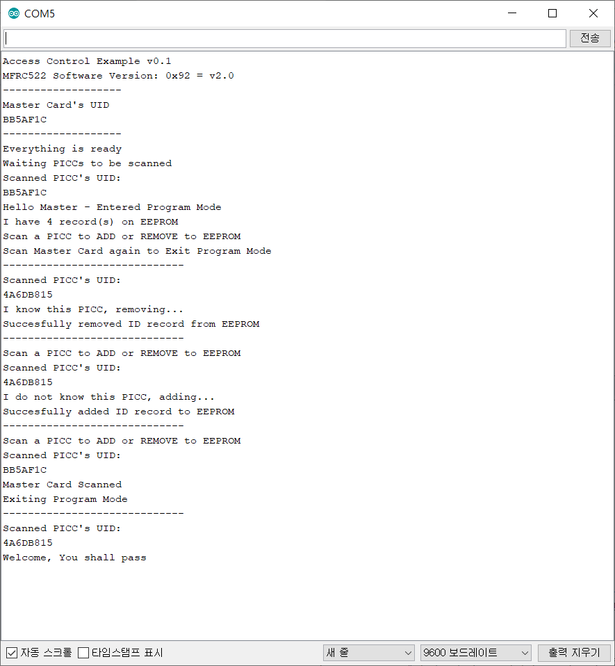 관리자 모드에서 사용자의 카드를 한번 인식시키면 등록이 되고 다시 한번 인식시키면 해지가 된다. 사용자 카드를 등록하고 다시 마스터 키를 갖다대면 관리자 모드를 빠져 나온다.