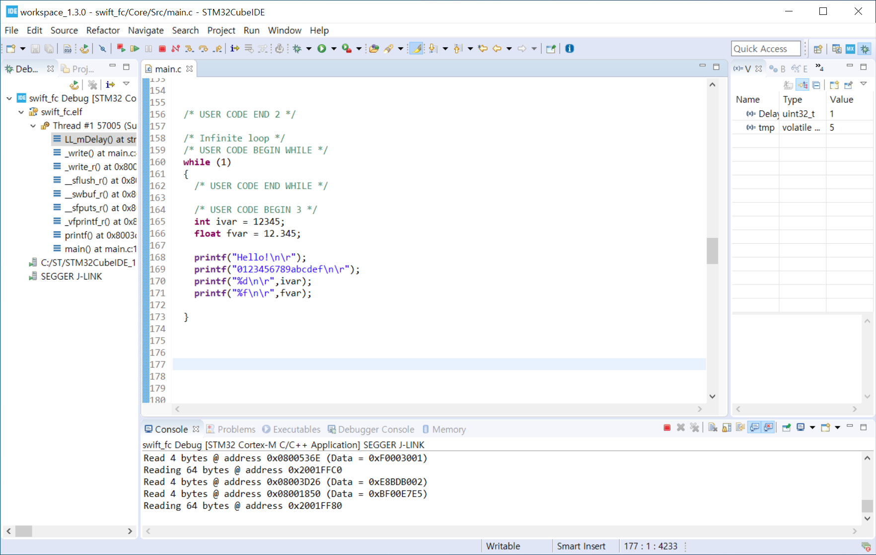 따라서 간단한 시간측정은 GPIO로 LED를 토글 시켜 시간을 측정하던가 printf가 필요하면 float 출력 기능이 없고 수행시간이 짧은 tiny printf 같은 함수를 사용하는 것이 좋다.