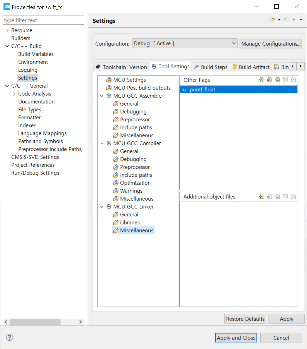 기본적으로 STM32CubeIDE에서는build 옵션에서 float형 변수들을 출력할 수 있는 옵션이 지정되어 있지 않다. 따라서 float형 변수들을 출력하기 위해서는 아래 경로를 찾아들어가서 다음과 같은 옵션을 지정해주어야 한다.